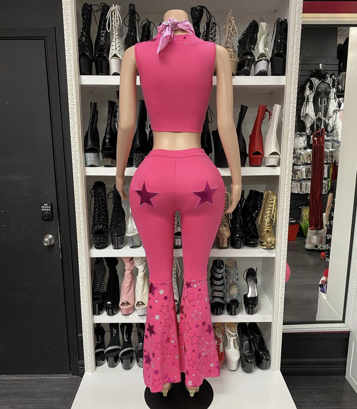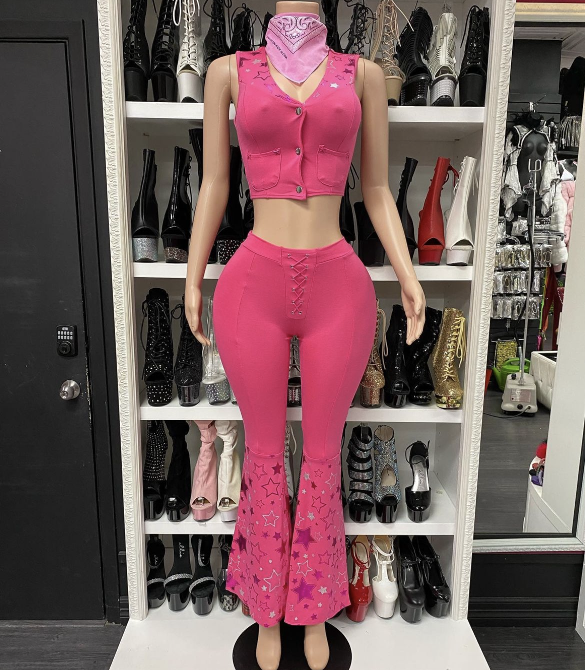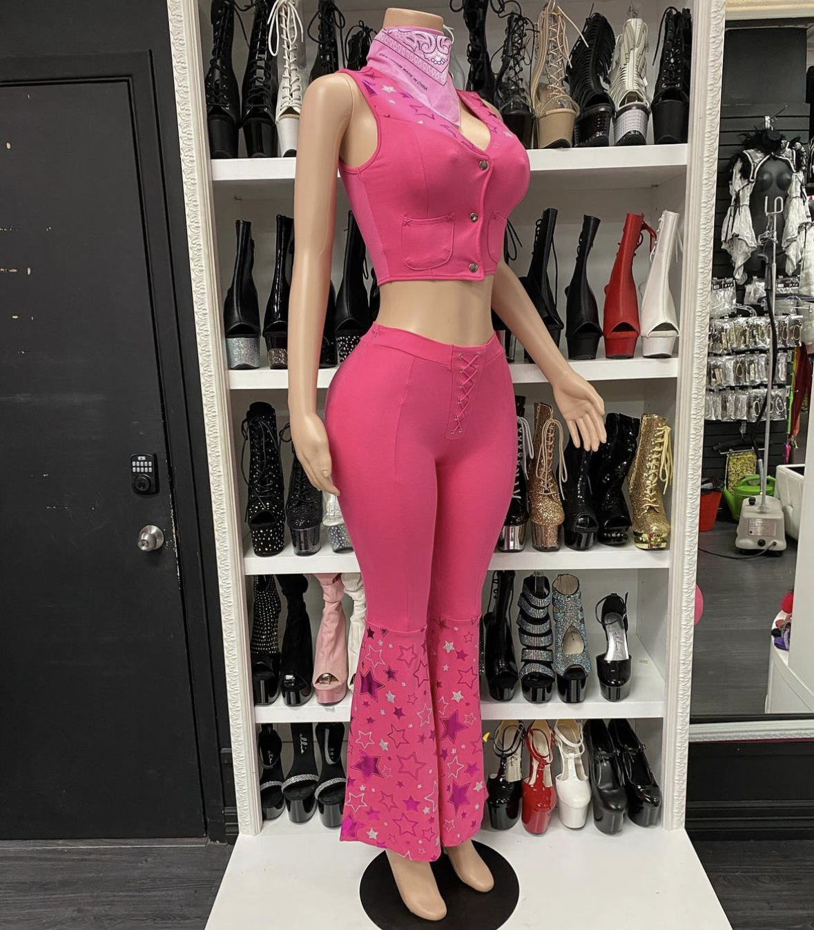 This three-piece set includes a cropped pink vest that buttons in the front and features star details on the chest. The high-waisted, lace-up flare pants come in a matching pink shade, adorned with metallic star prints on the legs.