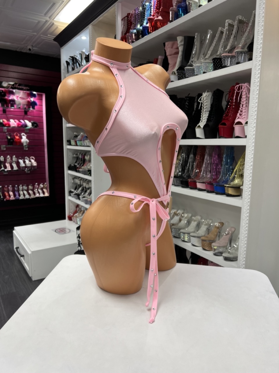 Pink cutout halter bodysuit with rhinestone detail and adjustable tie