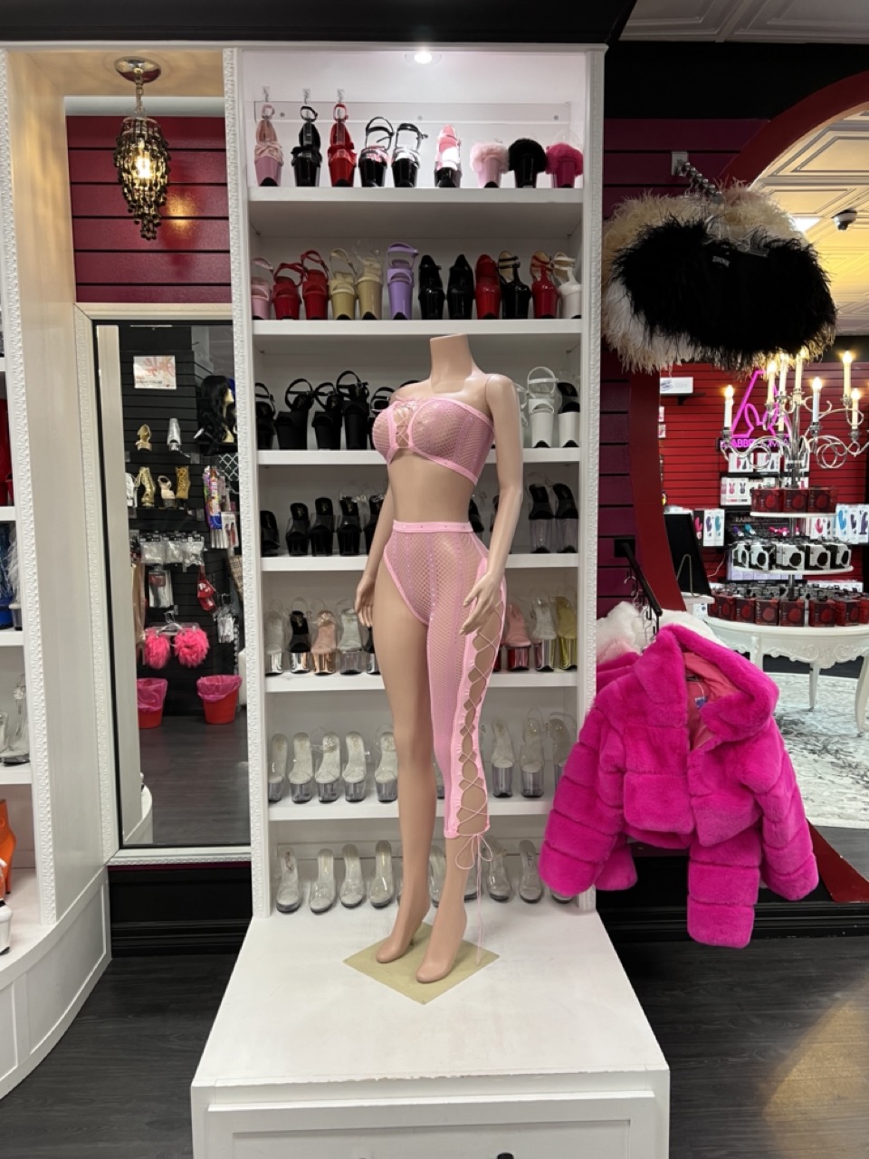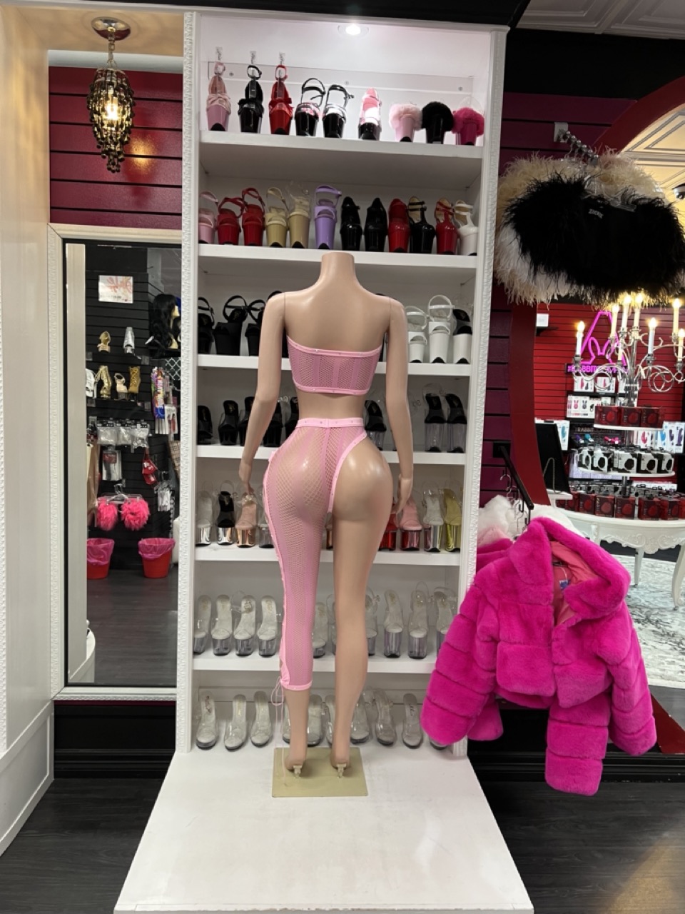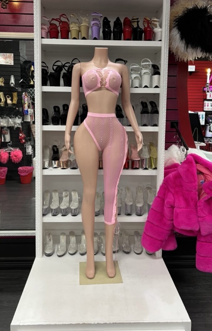 A bold two-piece pink fishnet set featuring a structured crop top and asymmetrical single-leg design. Modern, flattering, and stage-ready.