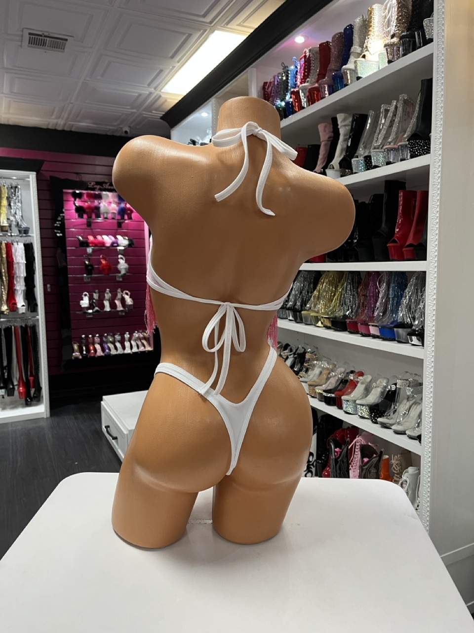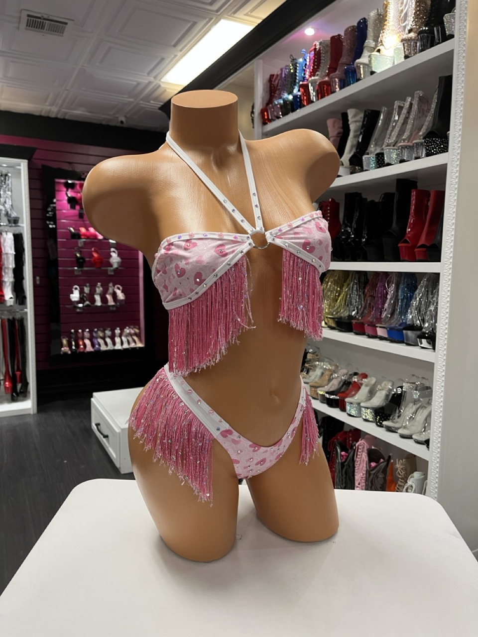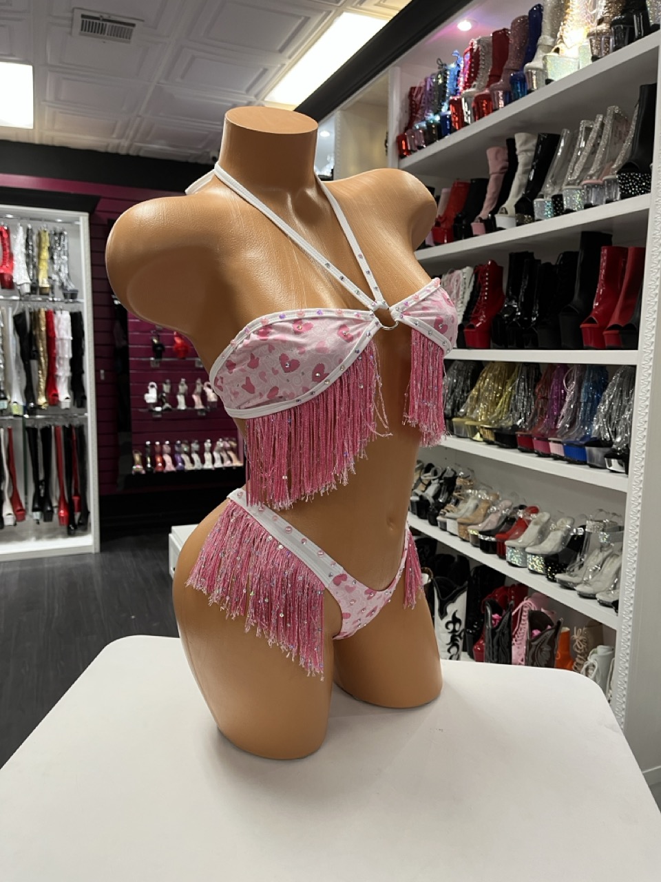 Pink heart print fringe three piece performance set displayed on mannequin