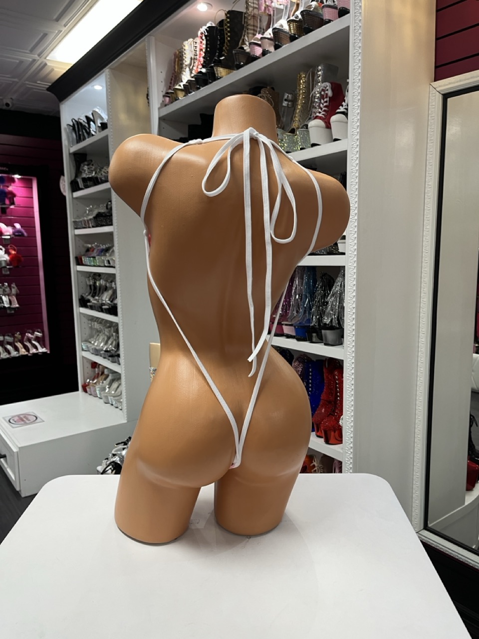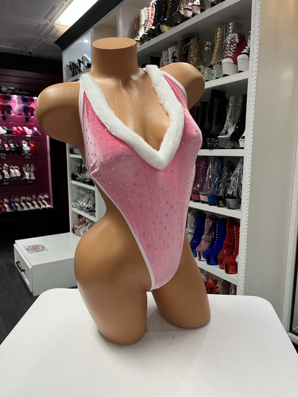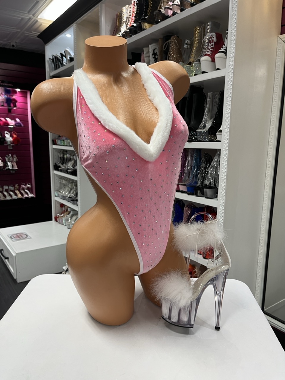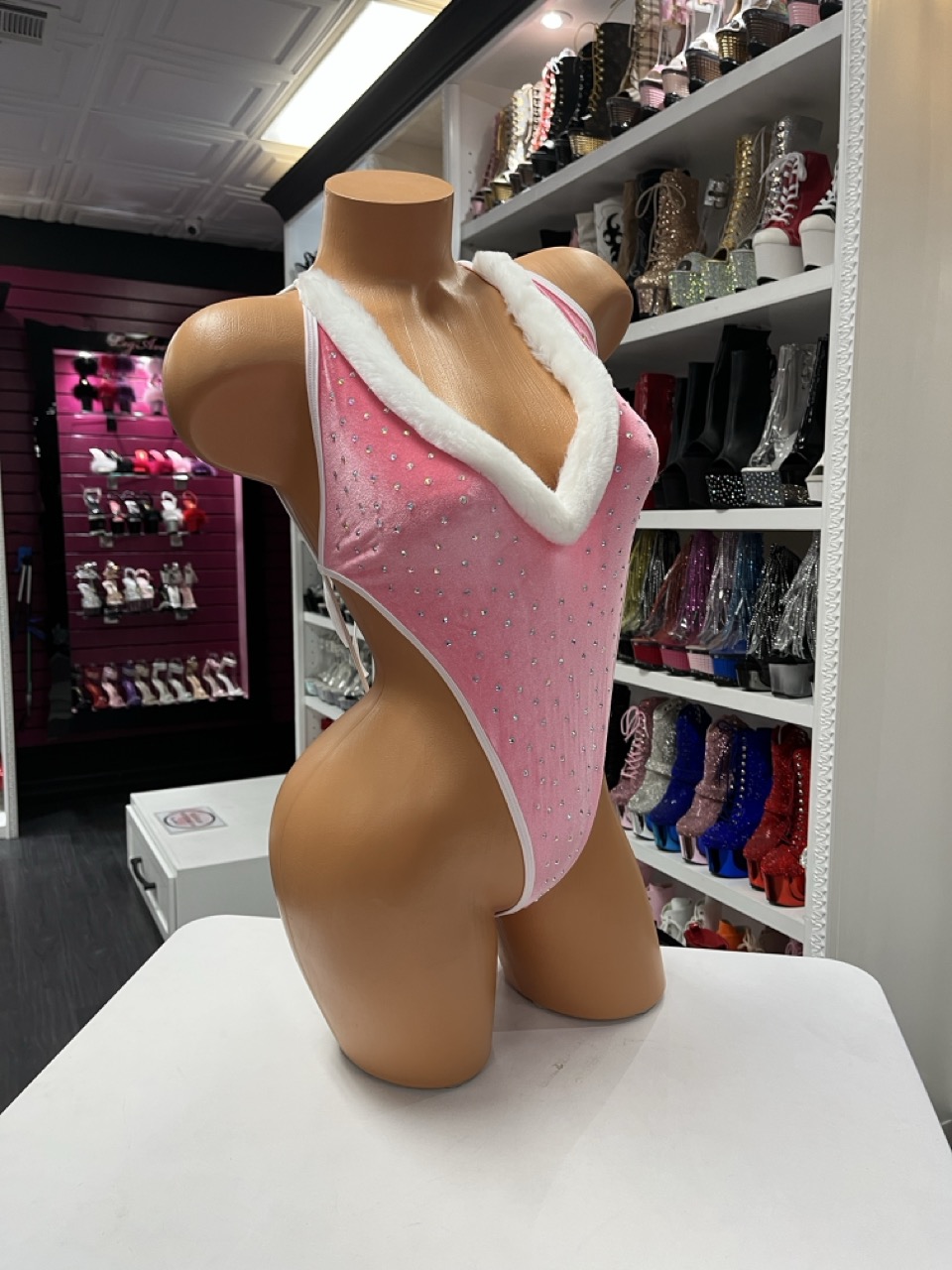 A pink bodysuit with sparkling accents and soft fur trim made for confident stage performances. Flattering, lightweight, and easy to move in.