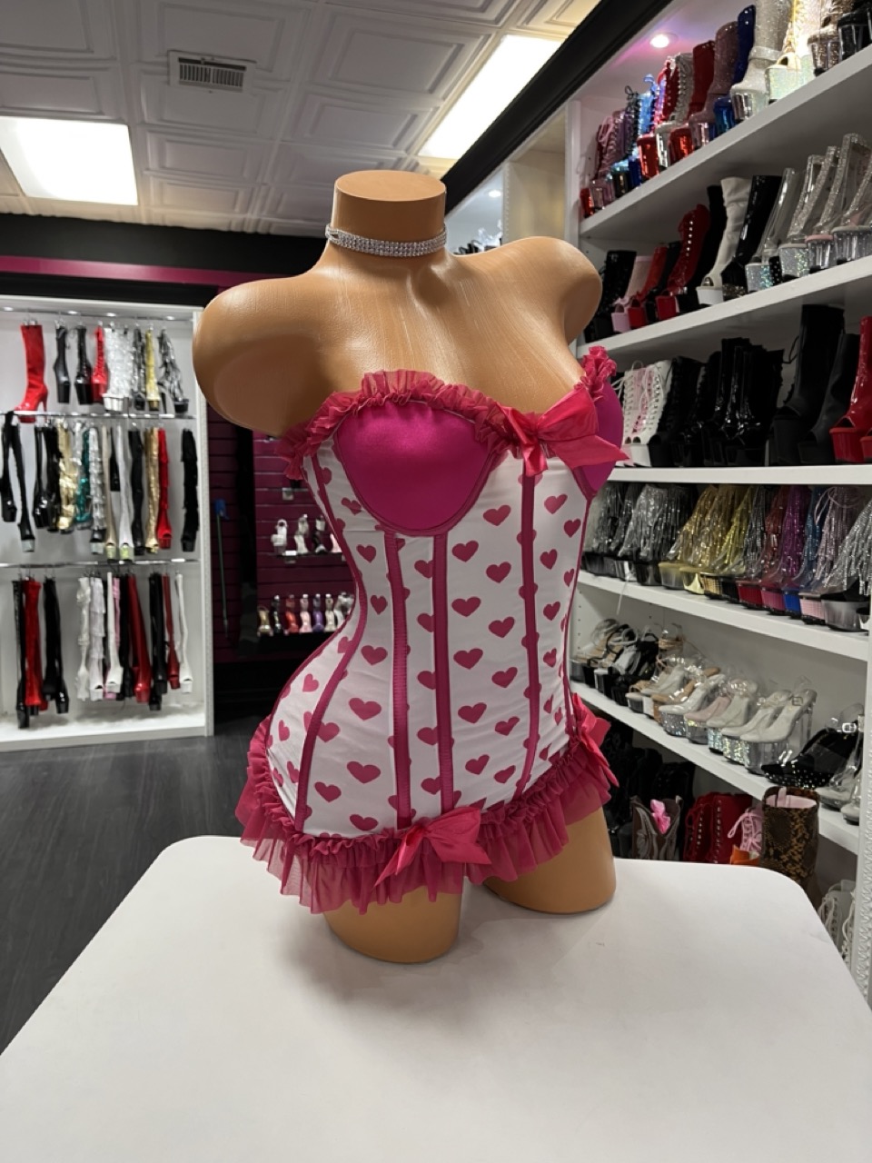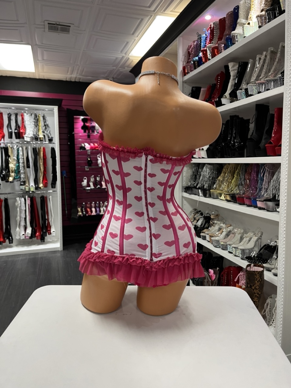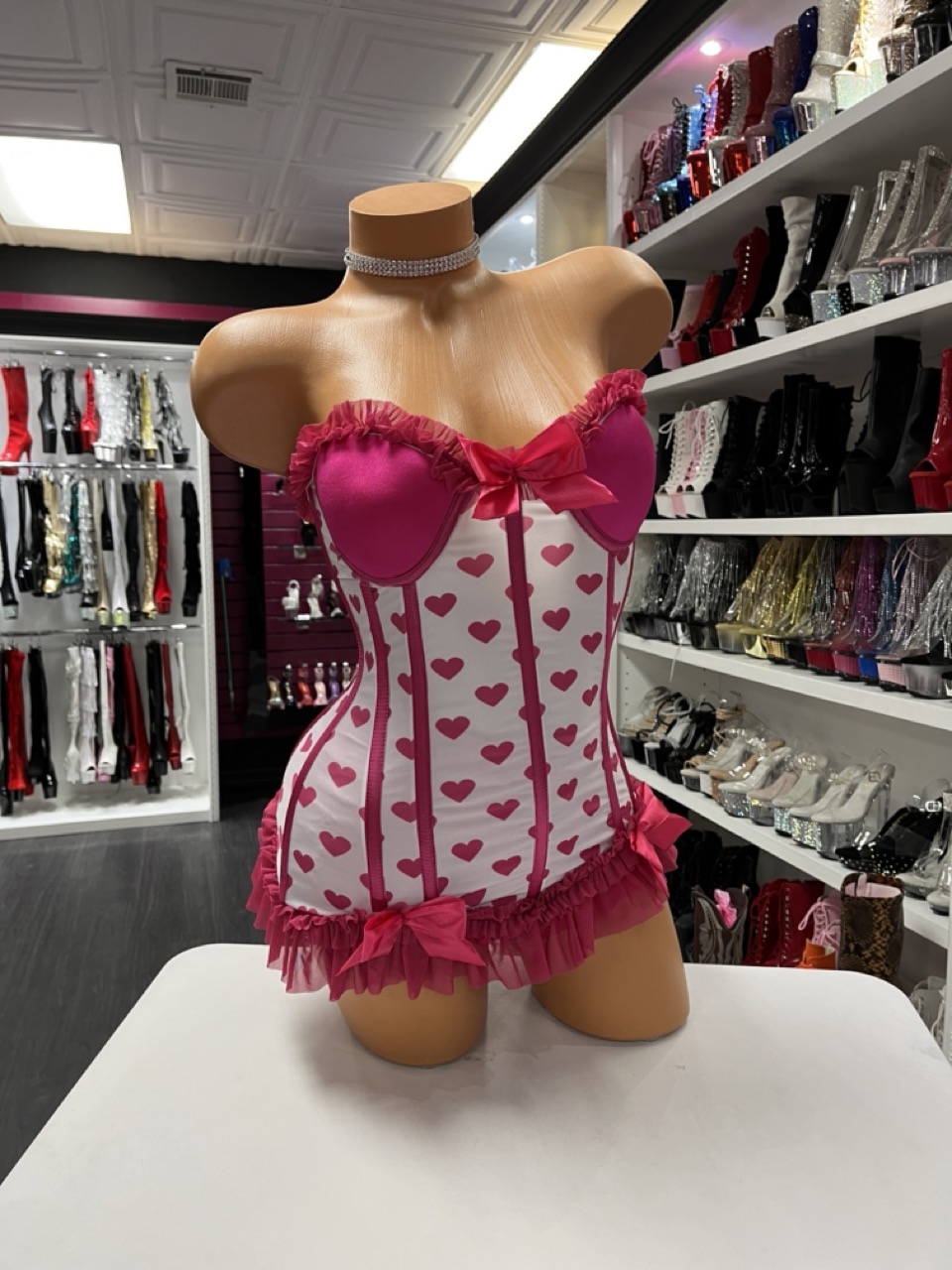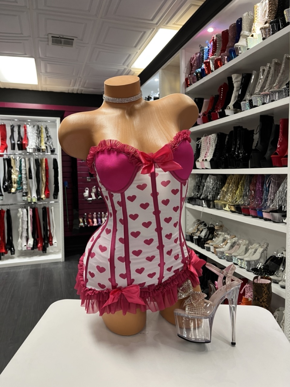 Strapless pink heart corset mini dress with ruffle trim and satin bow detail. Sweet romance meets stage glam.