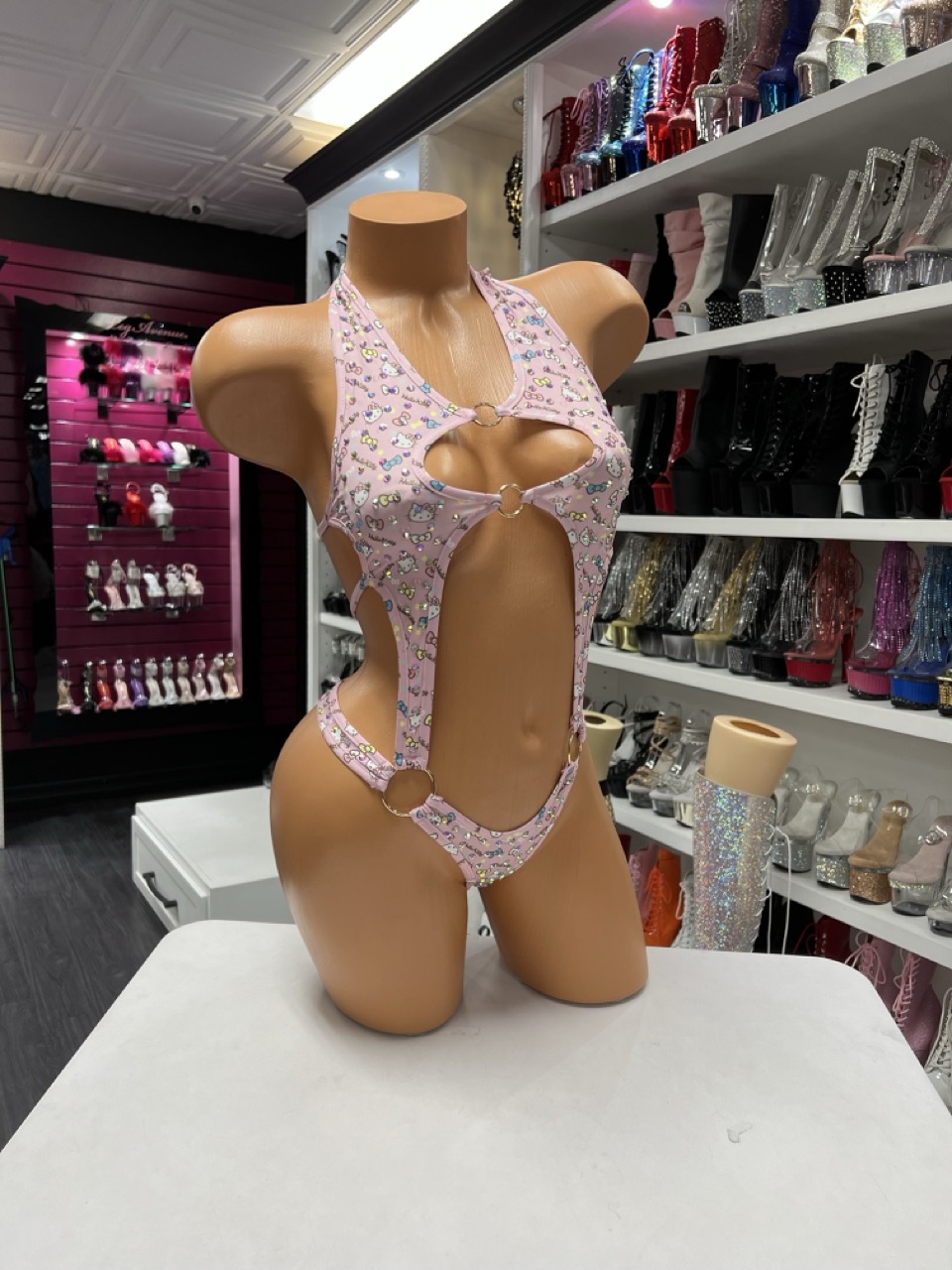 Pink kitty print bodysuit with halter neckline and ring cutouts