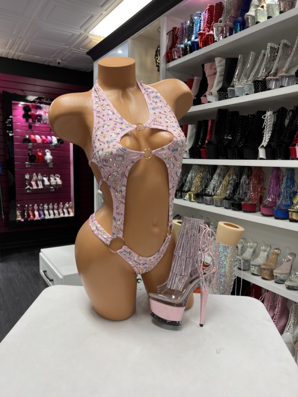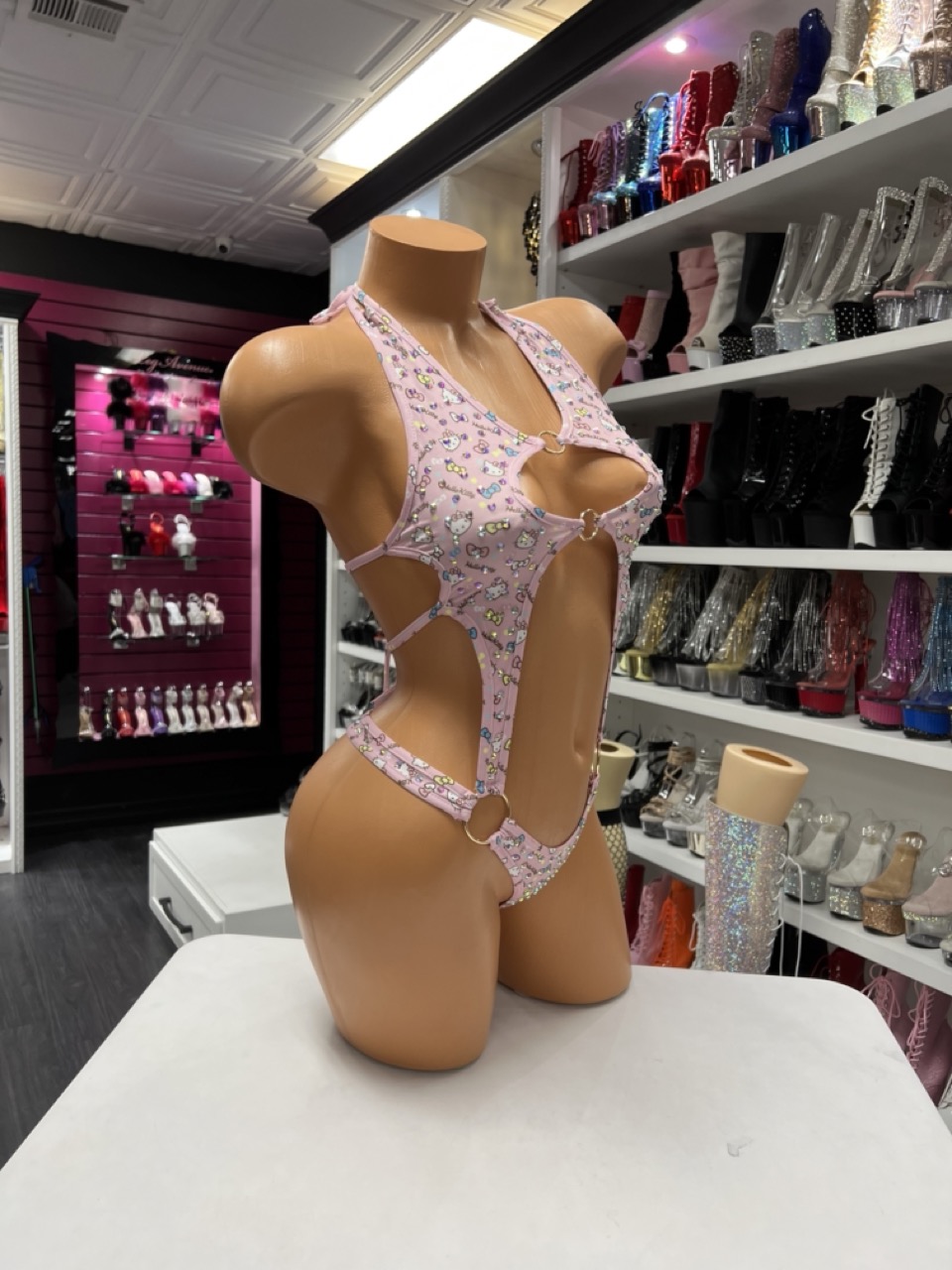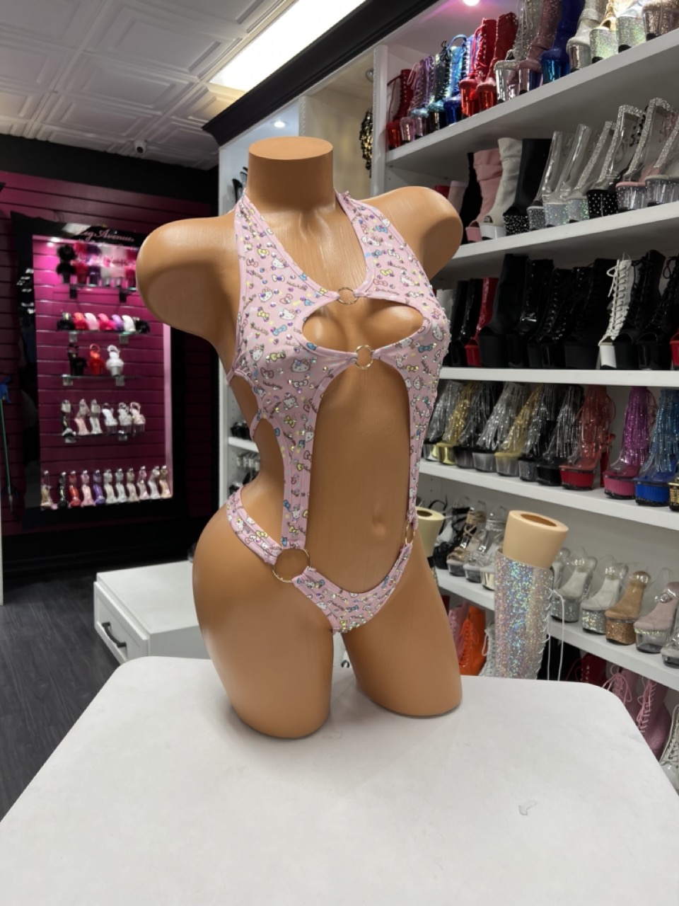 A playful pink kitty print bodysuit with bold cutouts and ring details. Stretchy, flattering, and perfect for standout looks.
