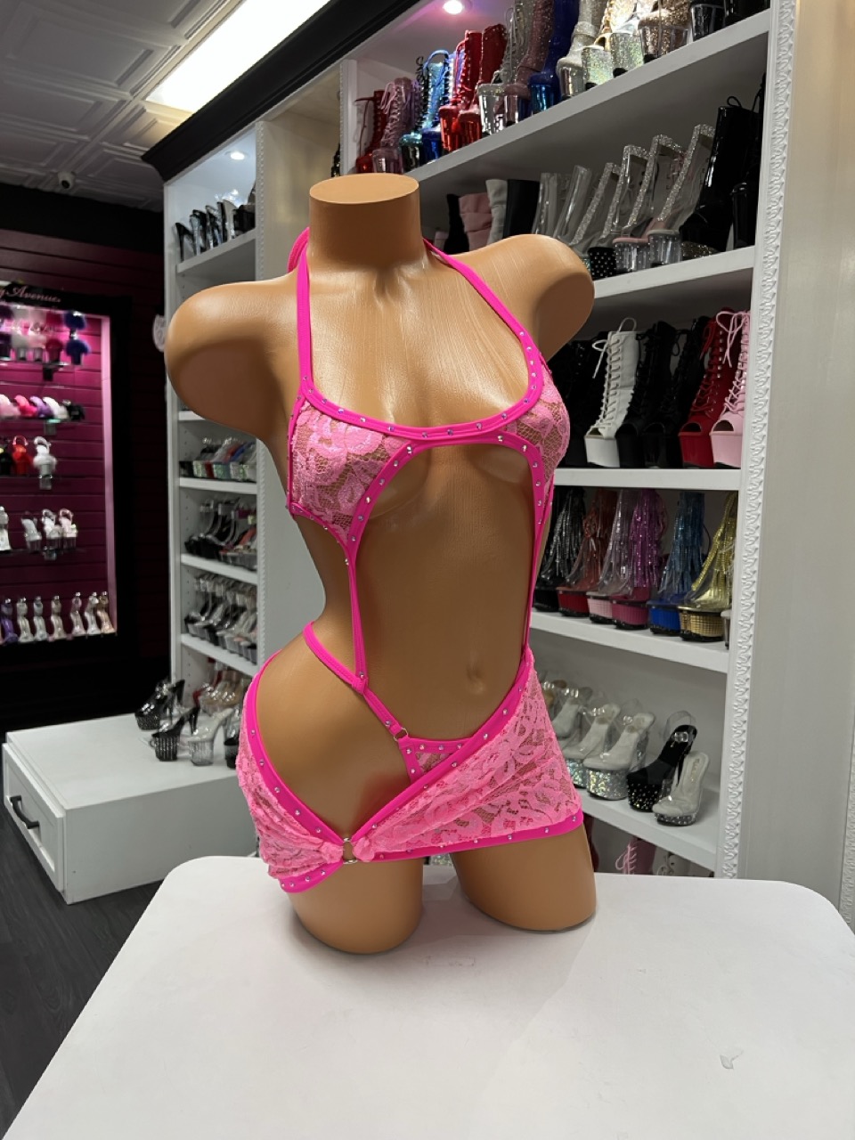 Pink lace micro romper with removable skirt and rhinestone trim detail. Flirty, bold, and designed to stand out.