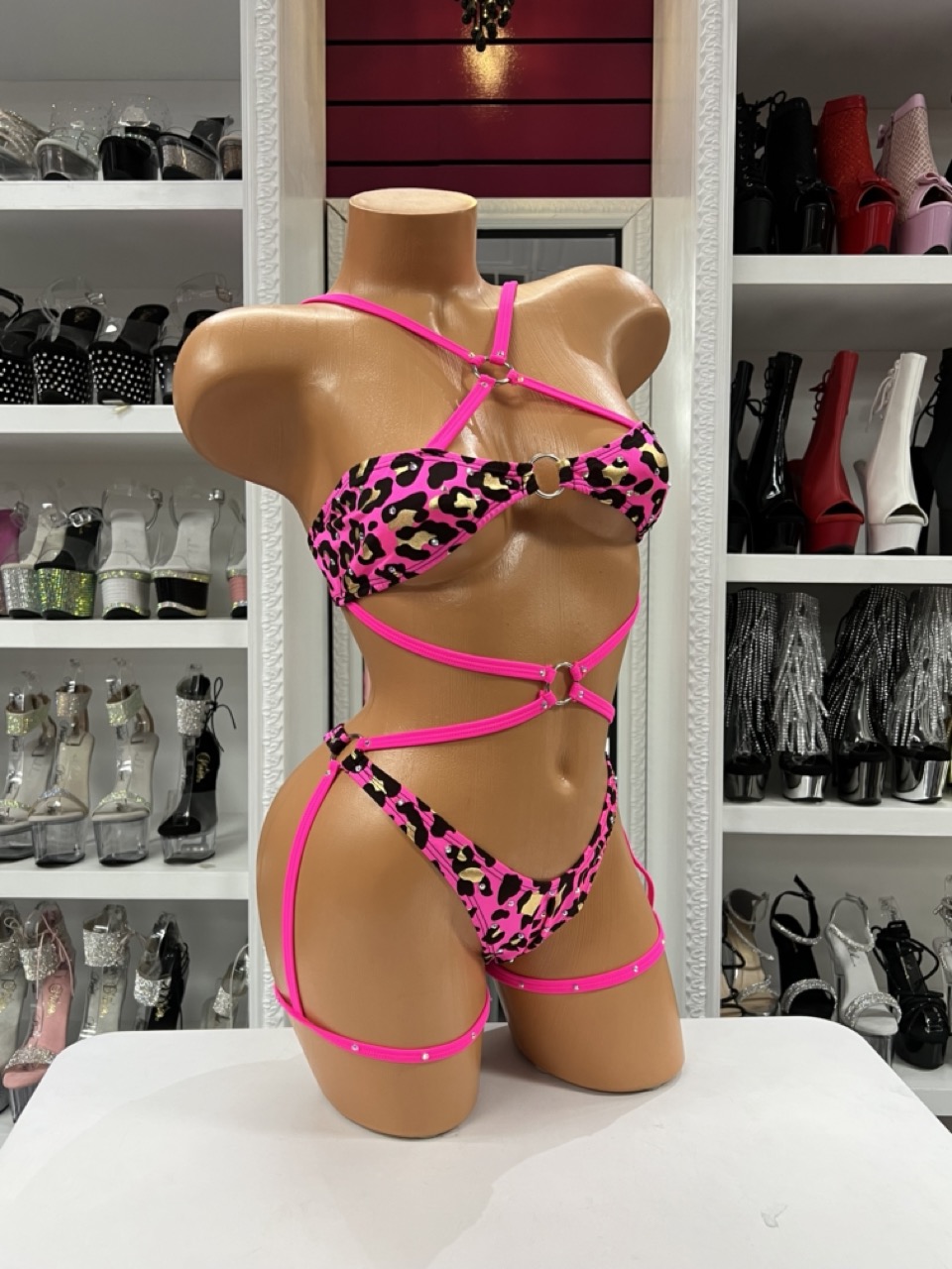 A pink leopard strappy set with neon harness details and a bold bandeau design. Eye-catching, adjustable, and perfect for standout looks.