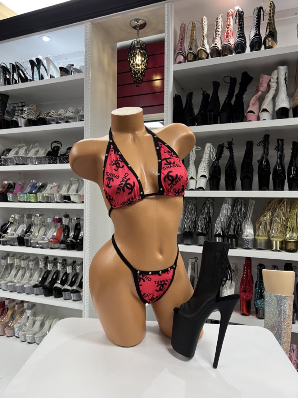 A bold pink logo bikini set with adjustable triangle cups and a matching micro thong. Soft, stretchy, and perfect for dancers and club looks.