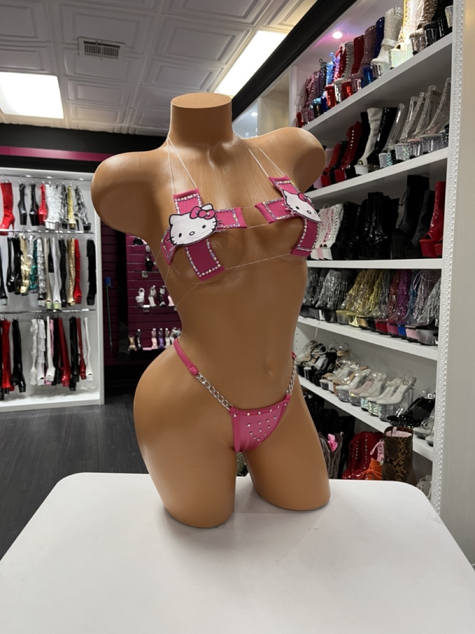 Pink rhinestone bow bikini set with clear straps and chain hip detail