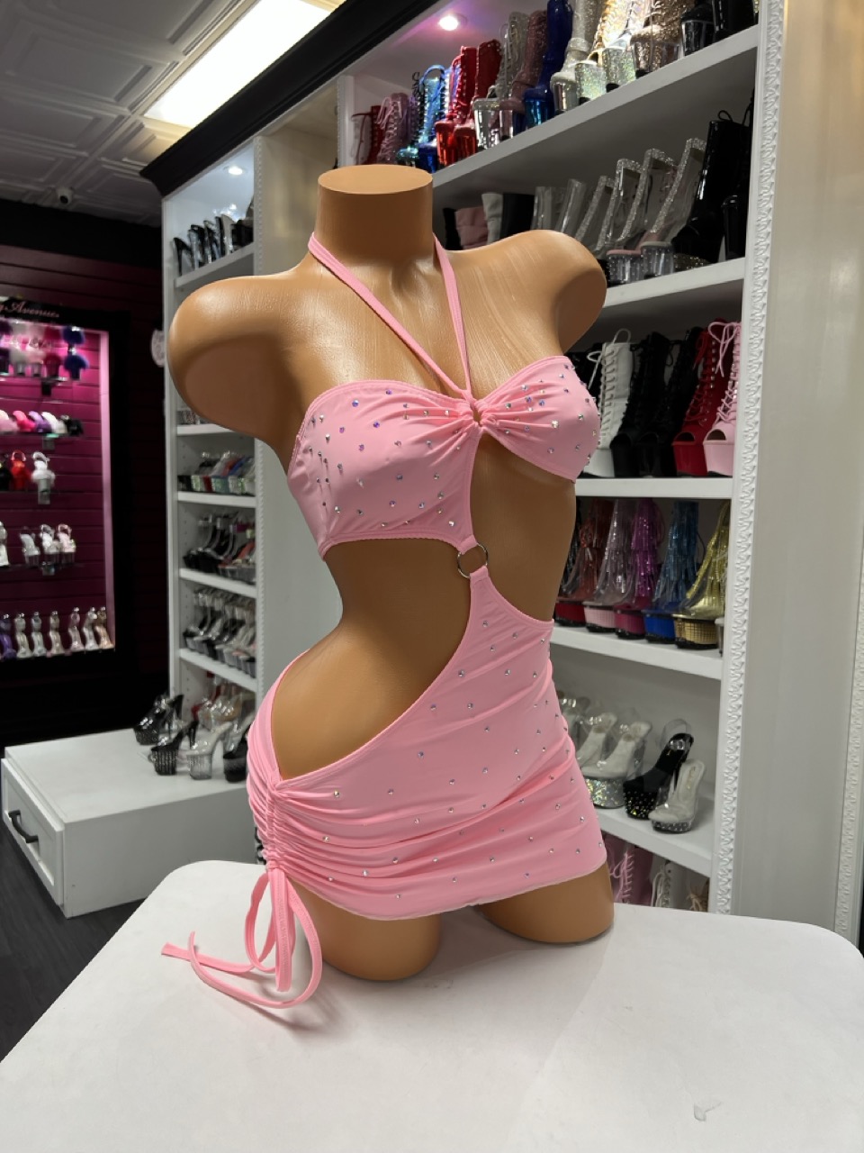 Pink rhinestone cutout dress with a halter neckline and adjustable side ruching. Flattering, bold, and designed to shine.