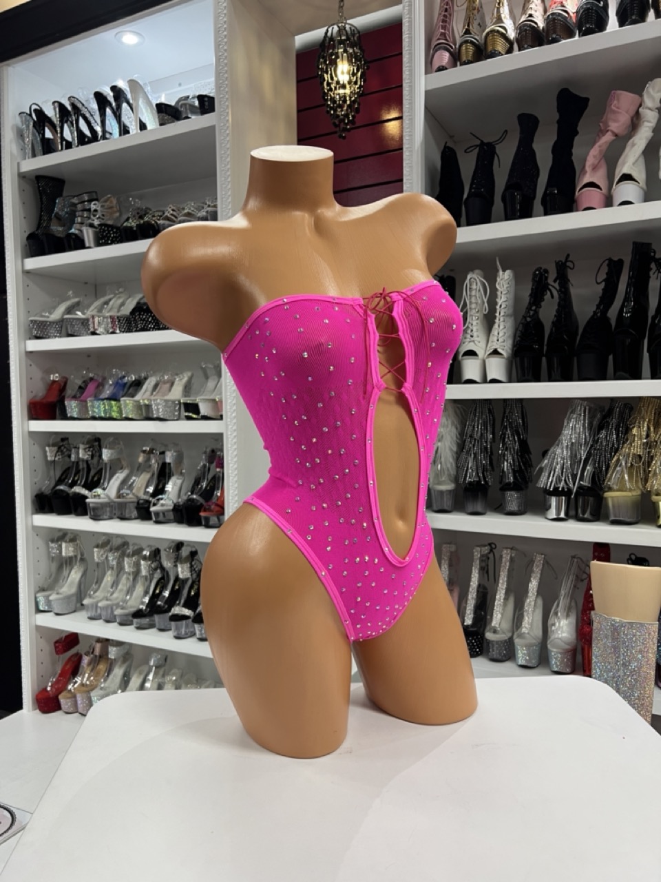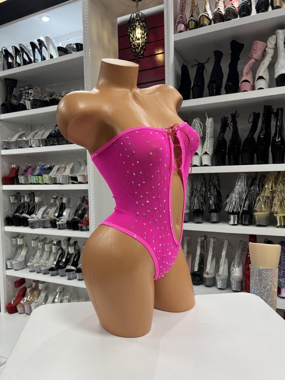 A hot pink rhinestone lace-up bodysuit with a bold cut-out and soft stretch fabric. Perfect for dancers, stagewear, and high-impact nightlife looks.