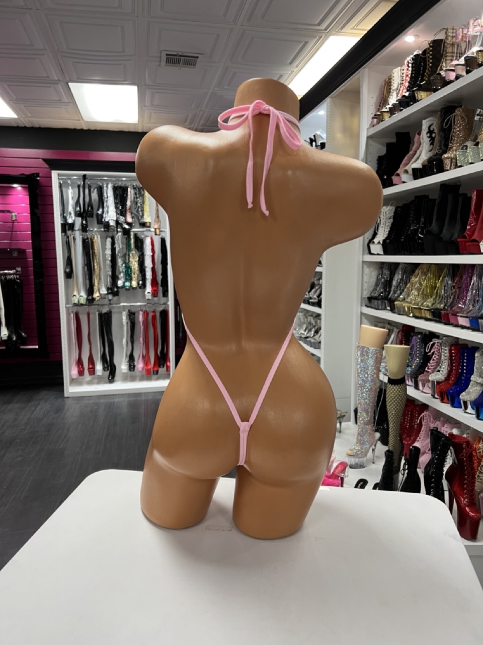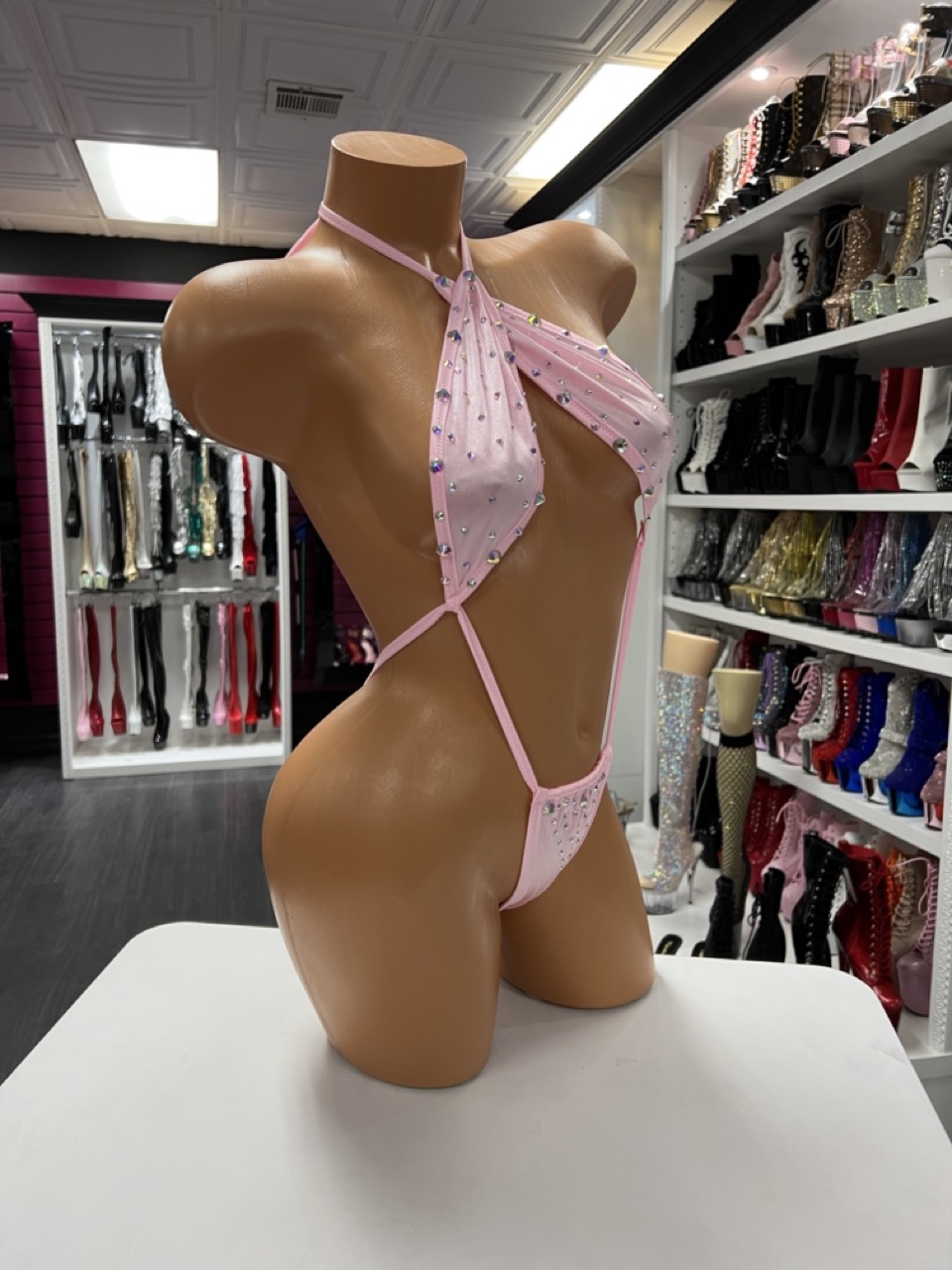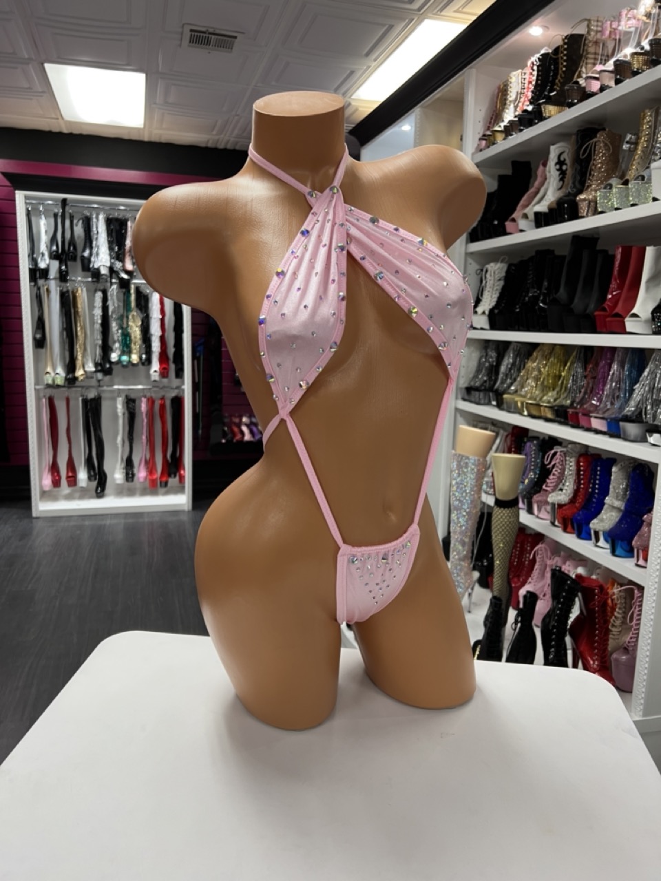 Pink slingshot bodysuit with rhinestone accents and adjustable halter straps. A bold, sparkling look designed for the spotlight.