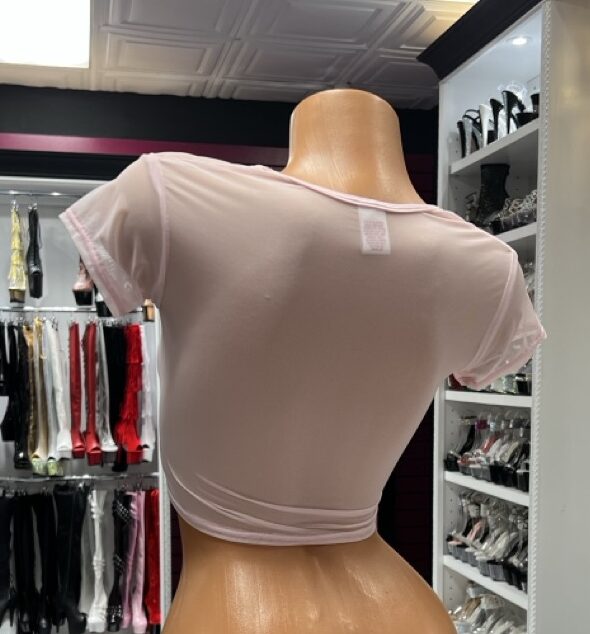 Blush-pink sheer crop top with scoop neckline and short sleeves — lightweight, stretchy, and perfect for layering or bold solo looks.