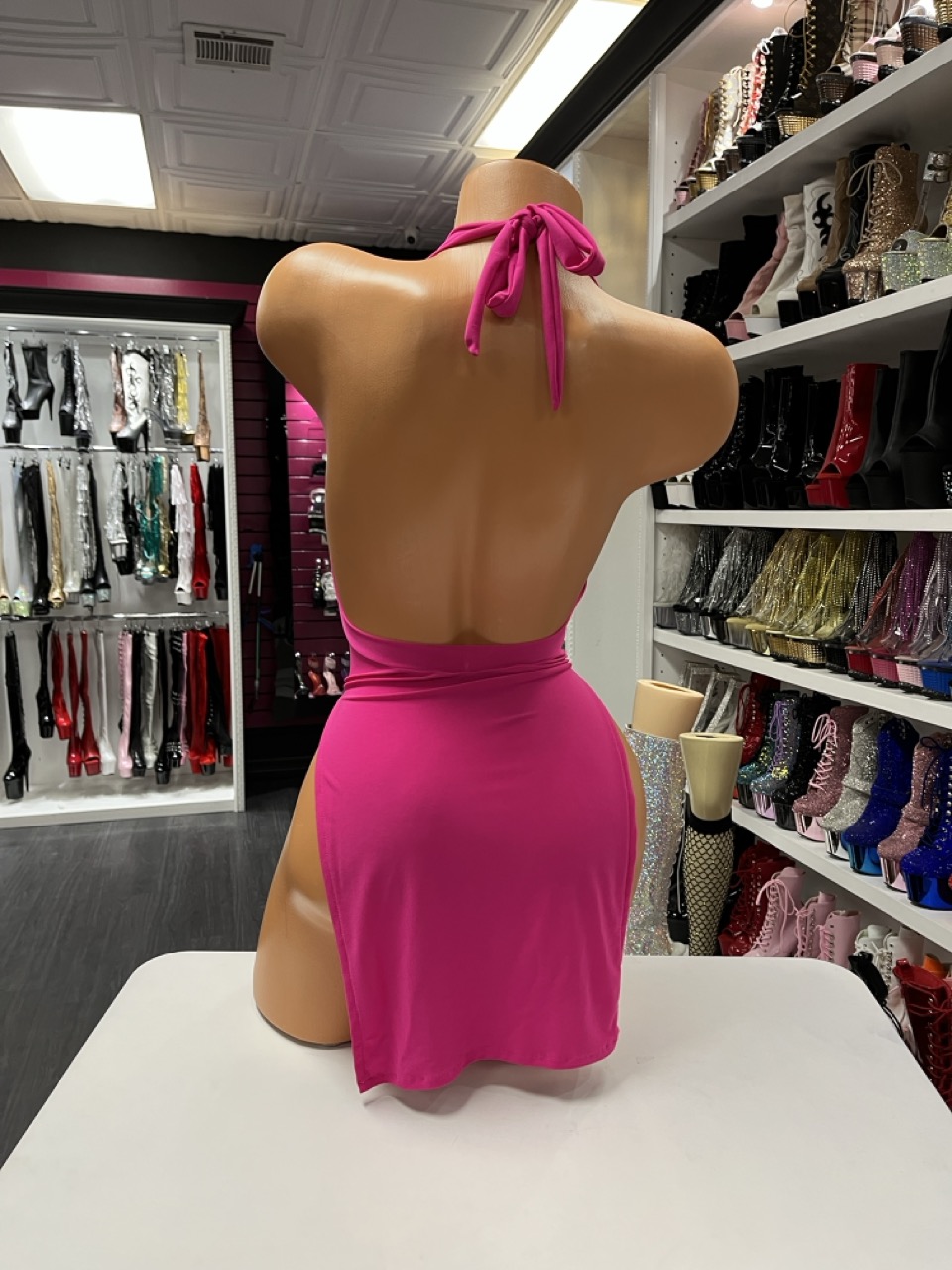 A sheer mini dress featuring a vibrant pink tone and a soft draped neckline. Lightweight fabric allows easy movement for performance or nightlife wear.