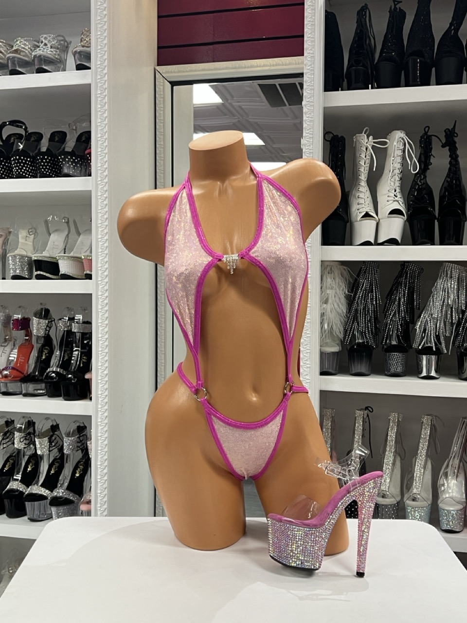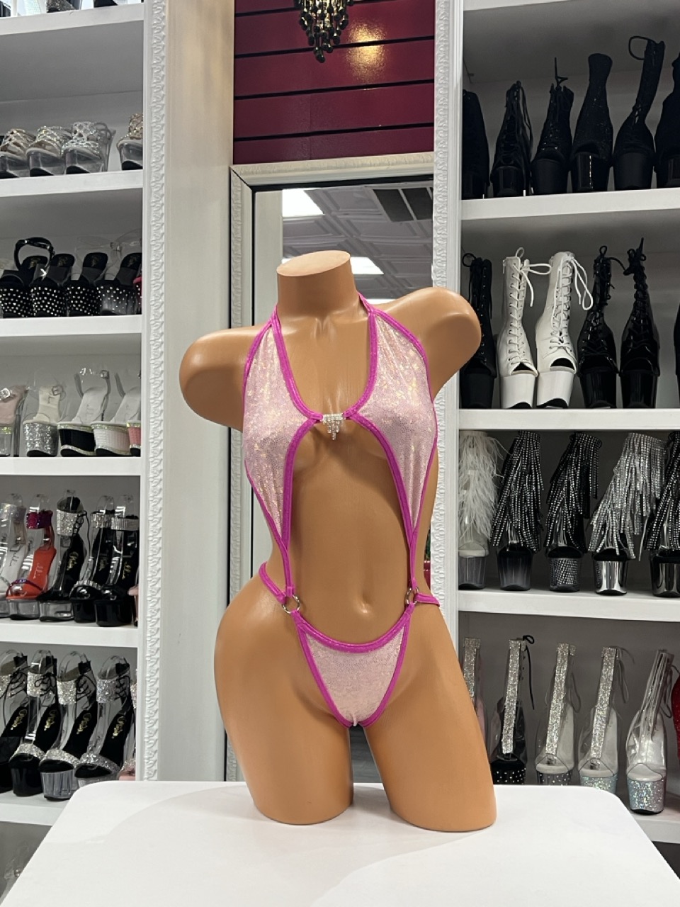 Pink shimmer slingshot bodysuit with rhinestone connectors and hot pink trim