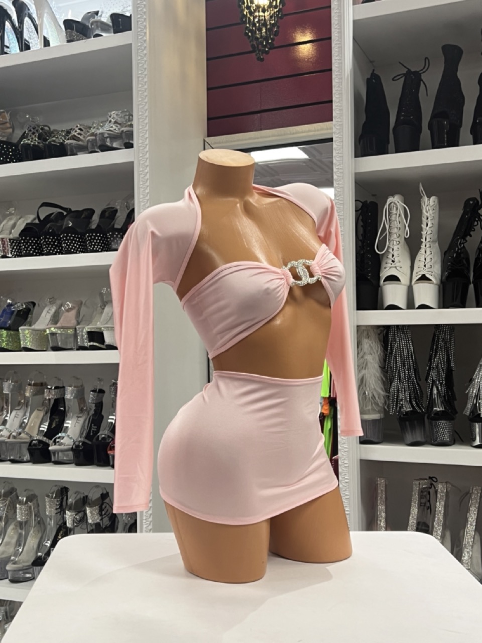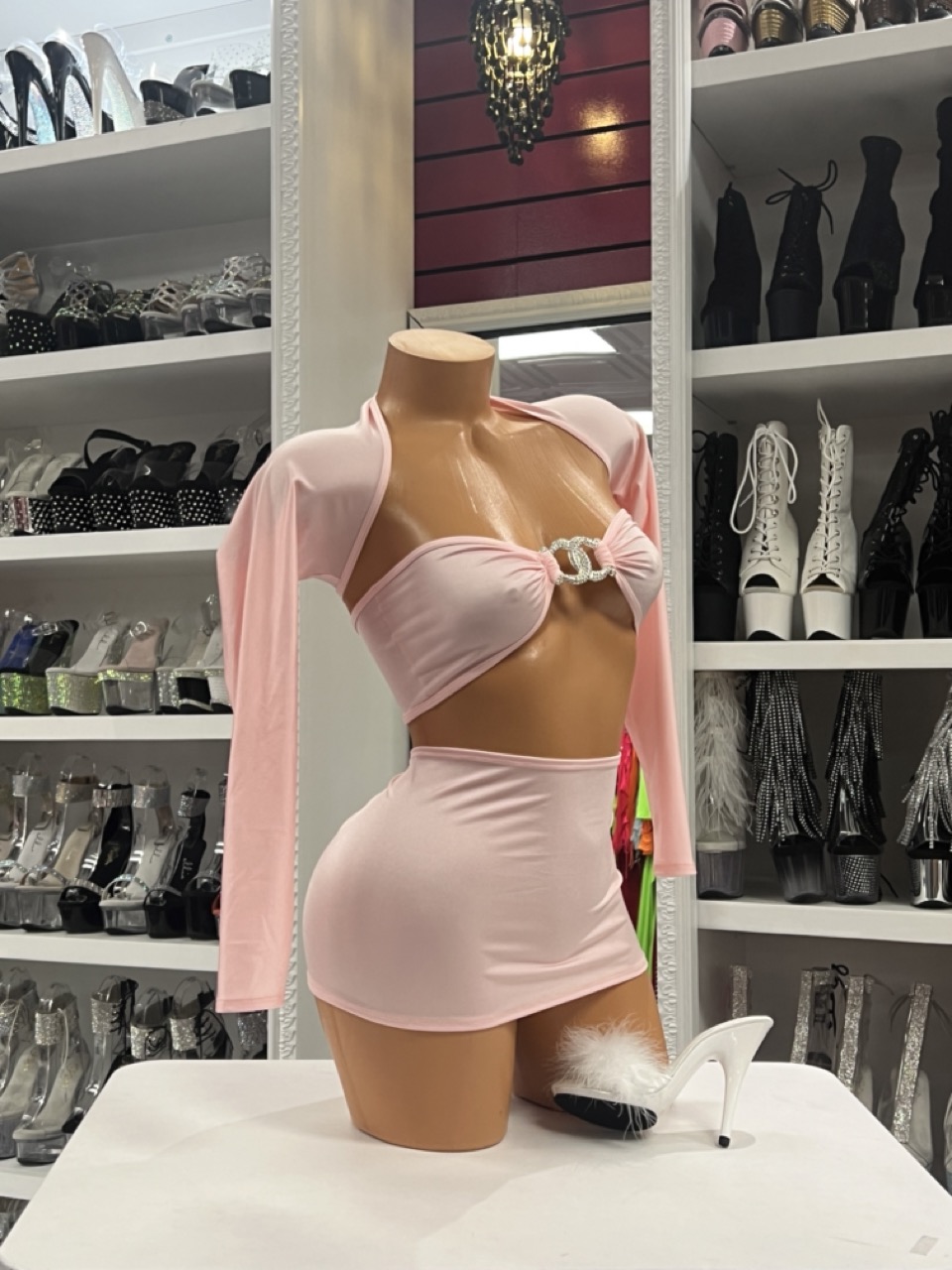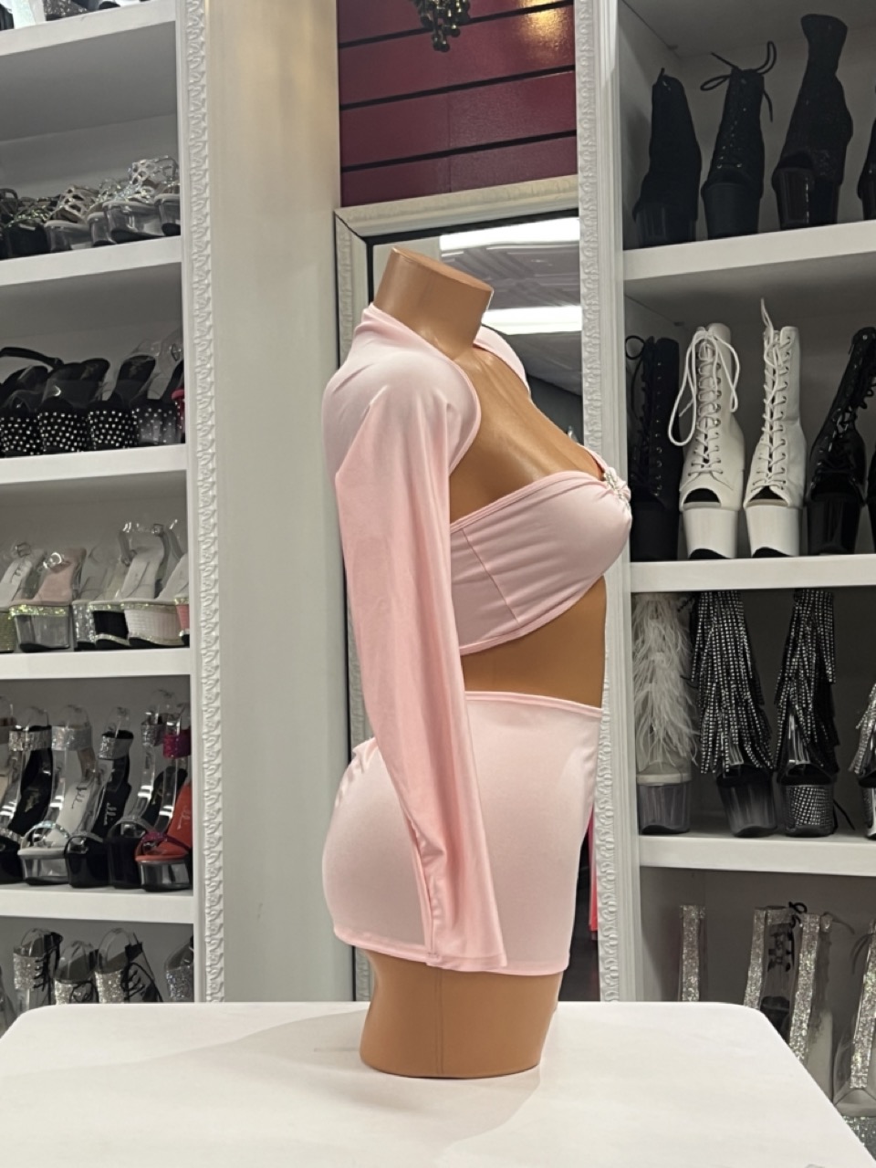 A soft and stretchy baby pink three-piece set with a matching bolero, rhinestone bandeau top, and smooth micro skirt. Perfect for dancers, stagewear, and nightlife looks.
