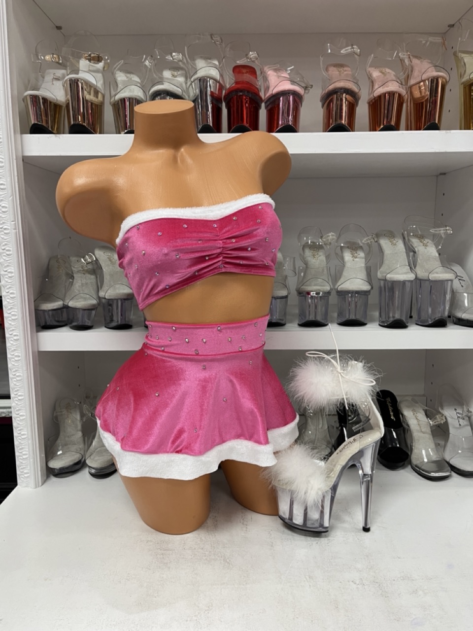 A bright pink velvet two-piece with rhinestones, a gathered bandeau top, and a flared mini skirt. Perfect for dancers who want a festive, playful stage look.