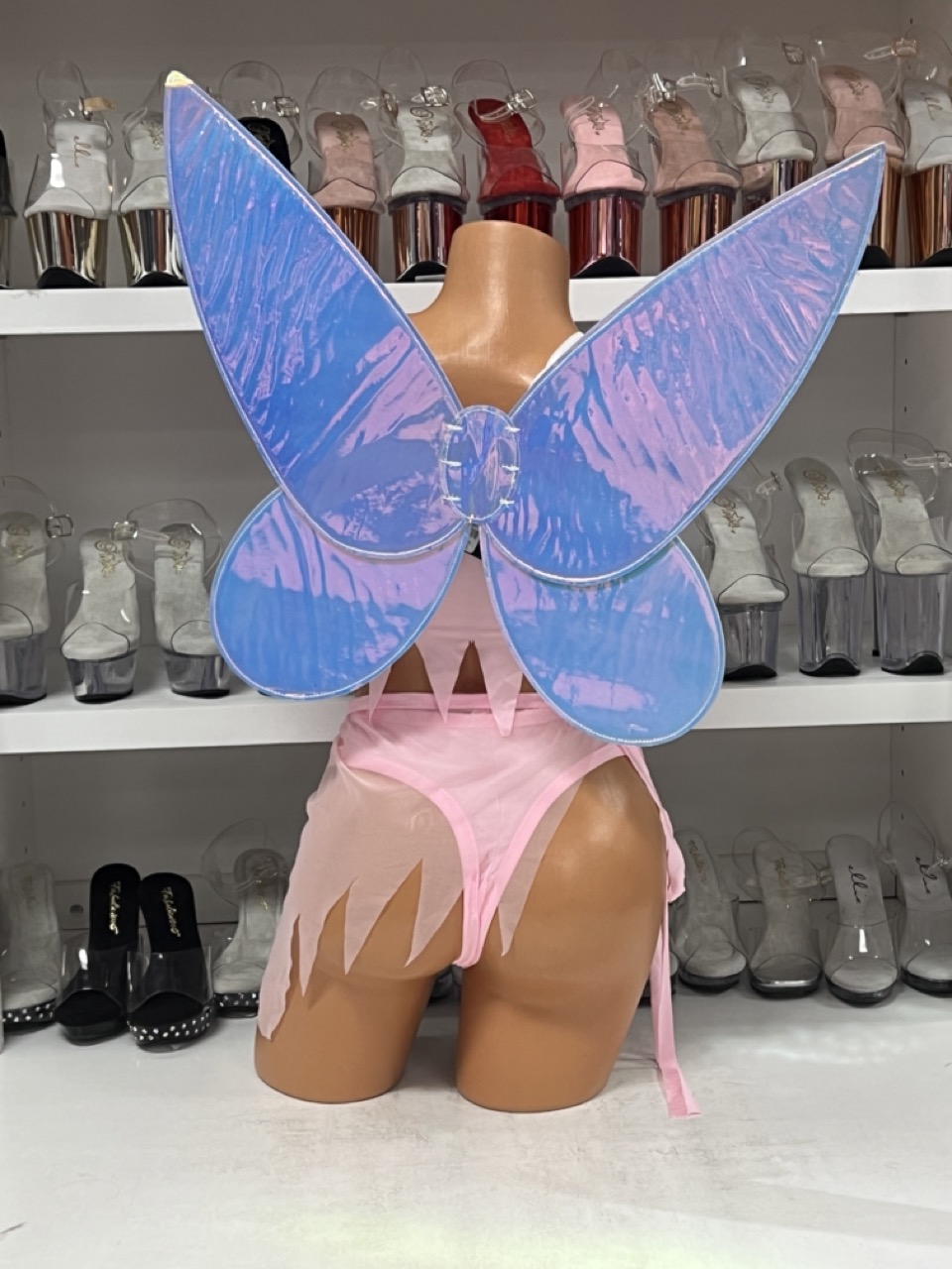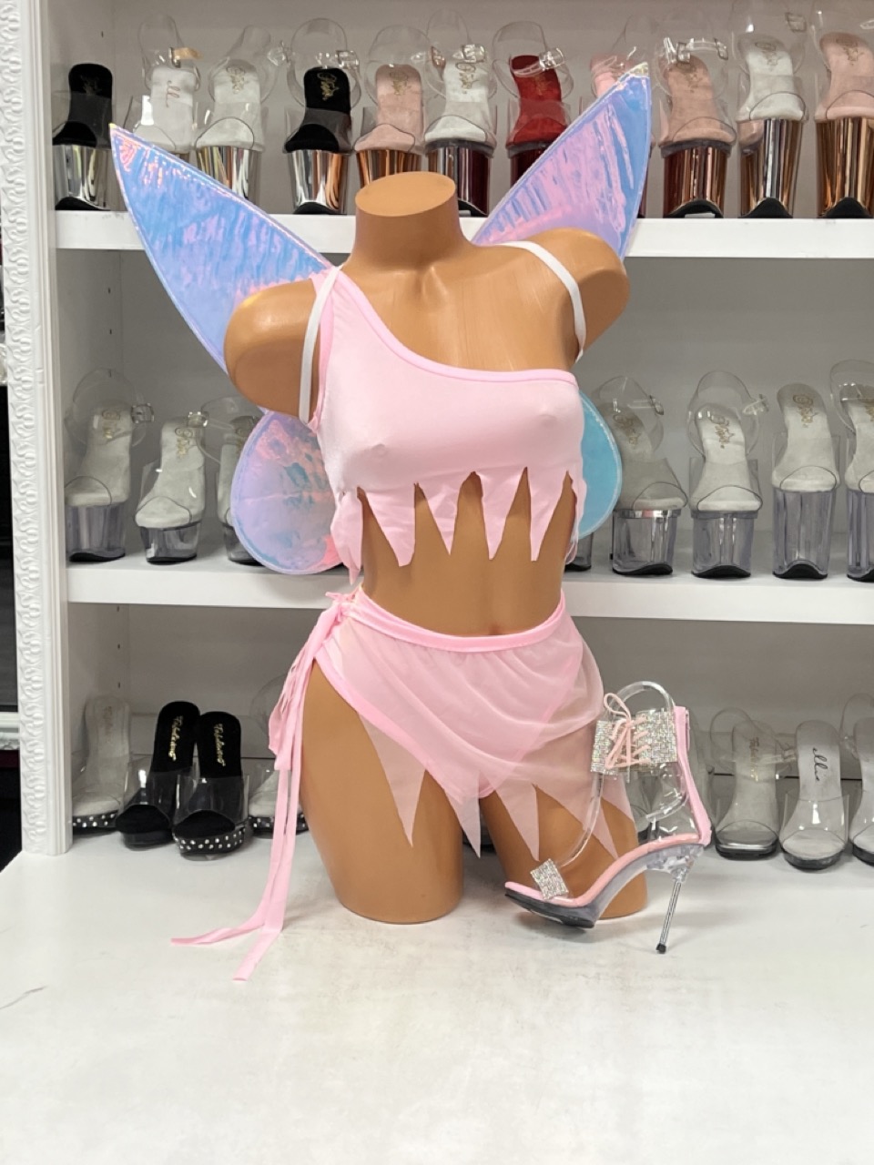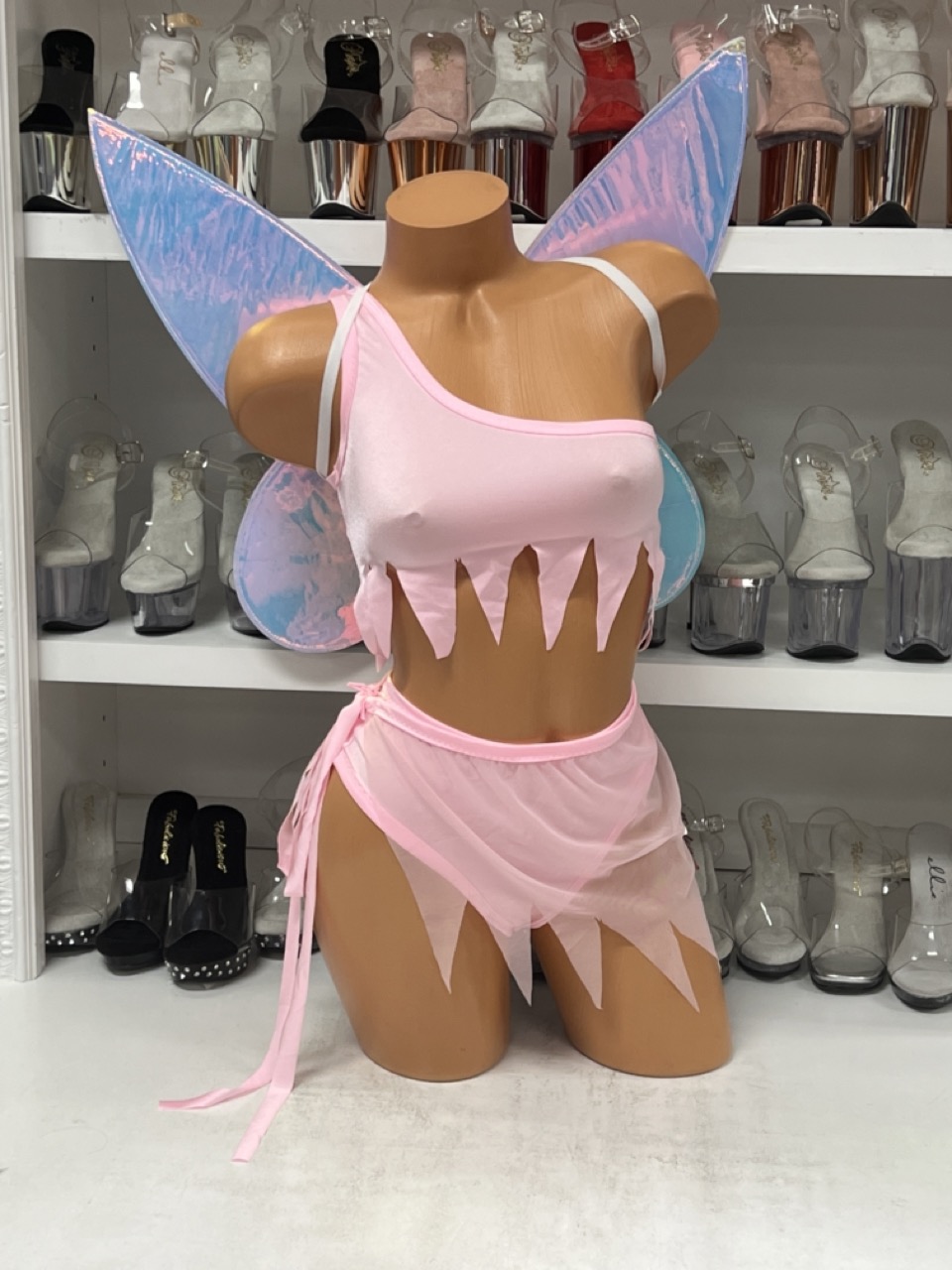 Pixie Dreams Mesh Set in soft pink mesh with jagged hem and tie skirt. Fairy wings sold separately.