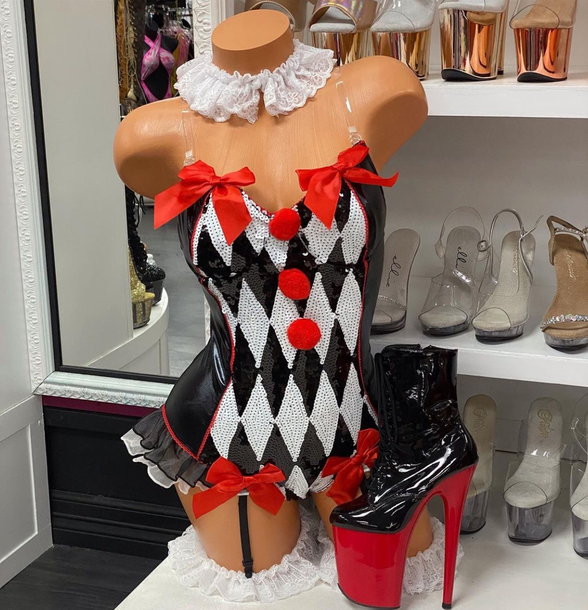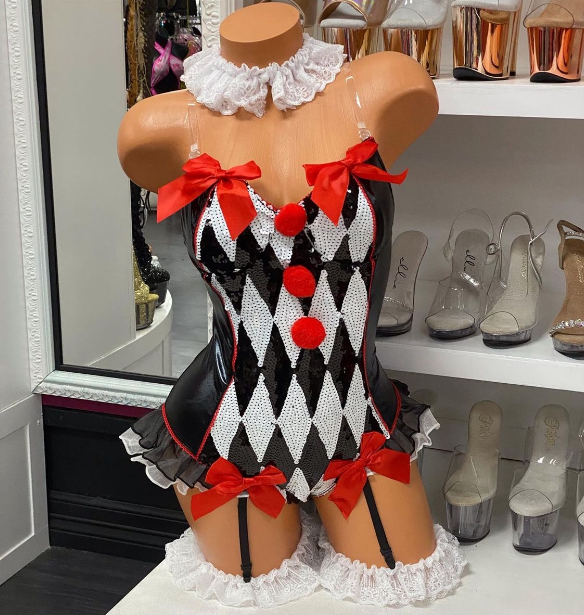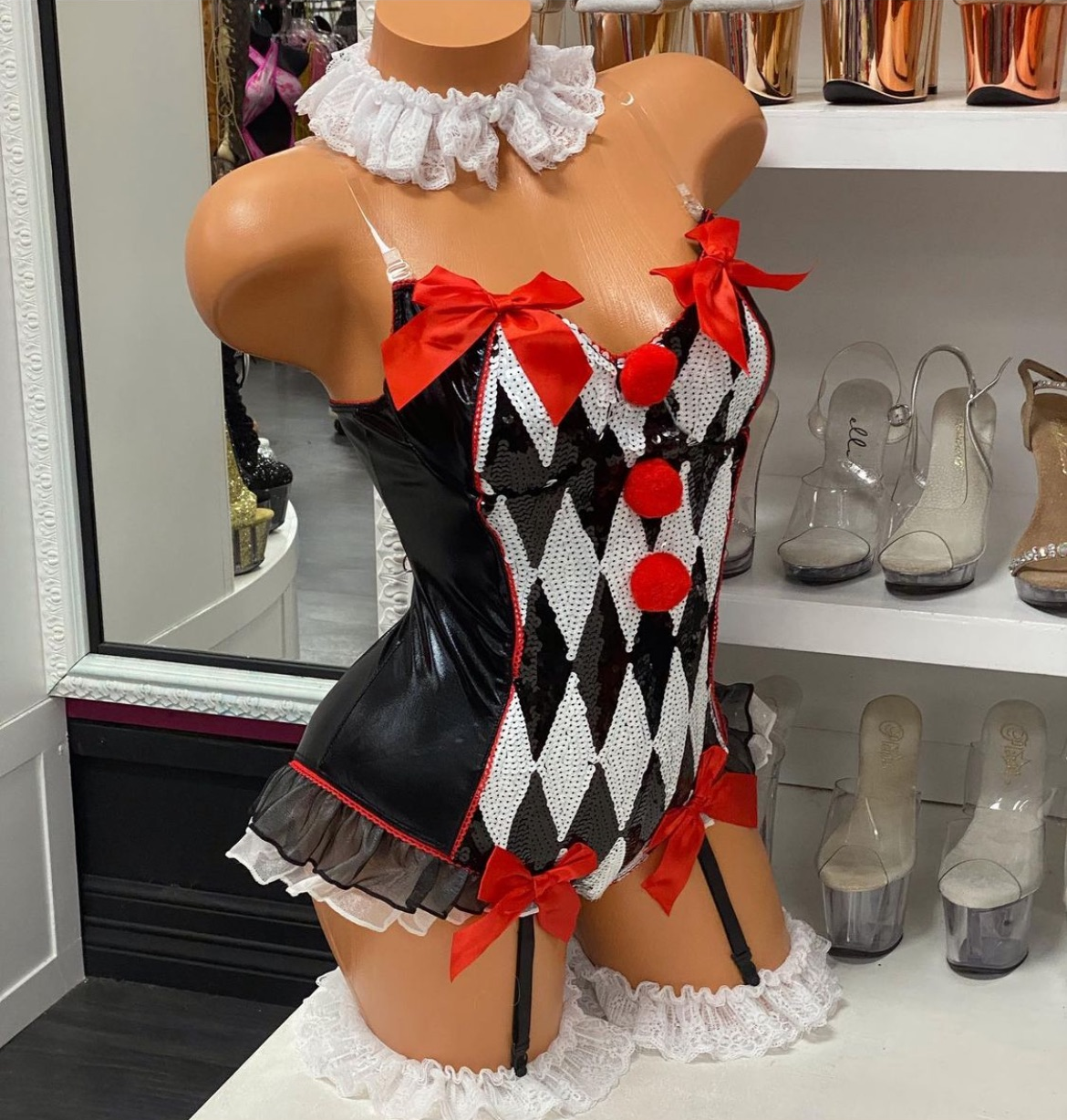 Includes teddy, garters and neckpiece. No returns or exchanges.