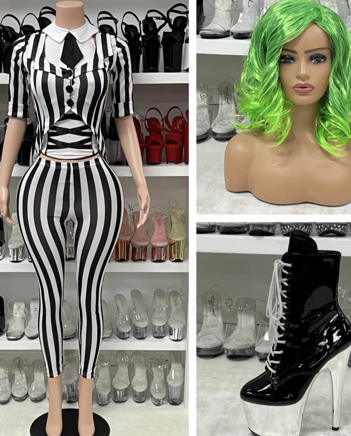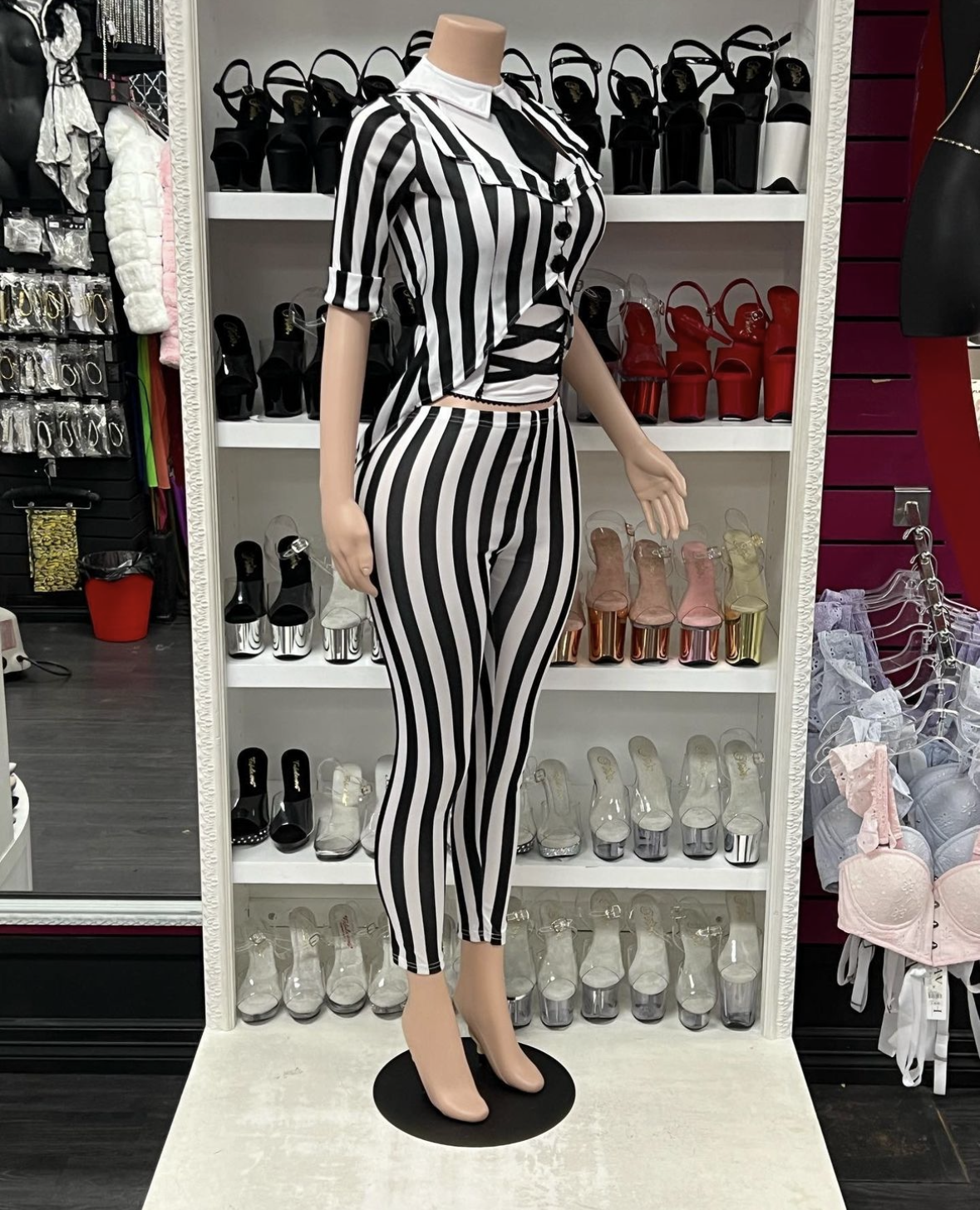 Includes Jacket, Leggings, Mock bustier halter top, Necktie. No returns or exchanges.