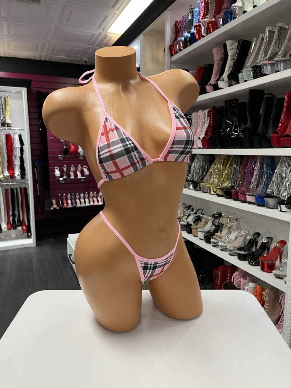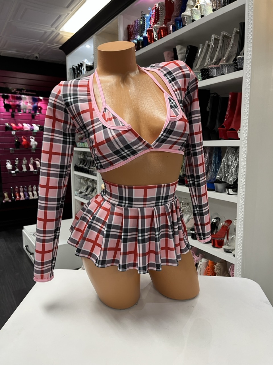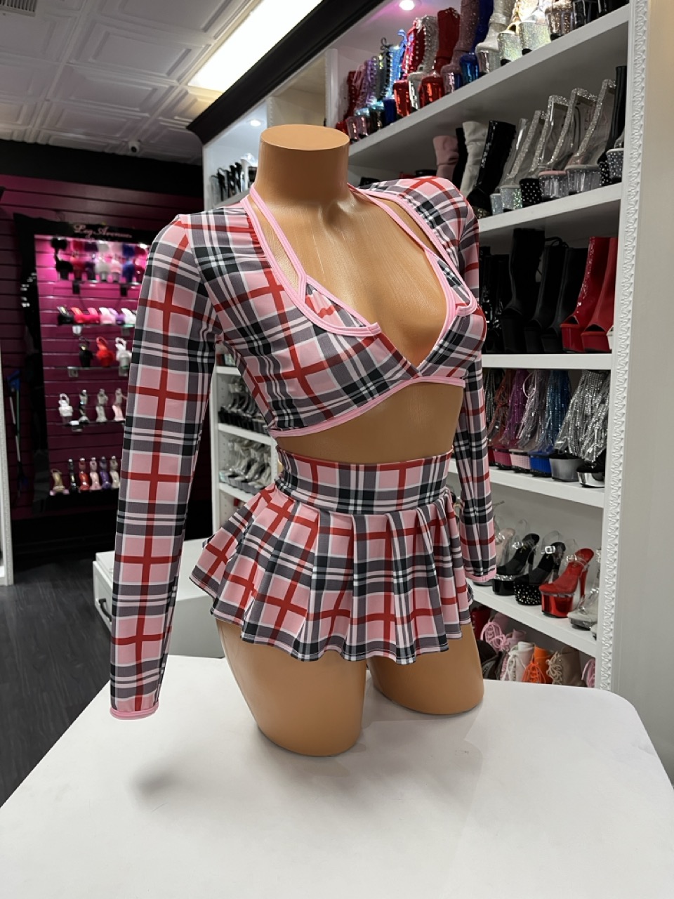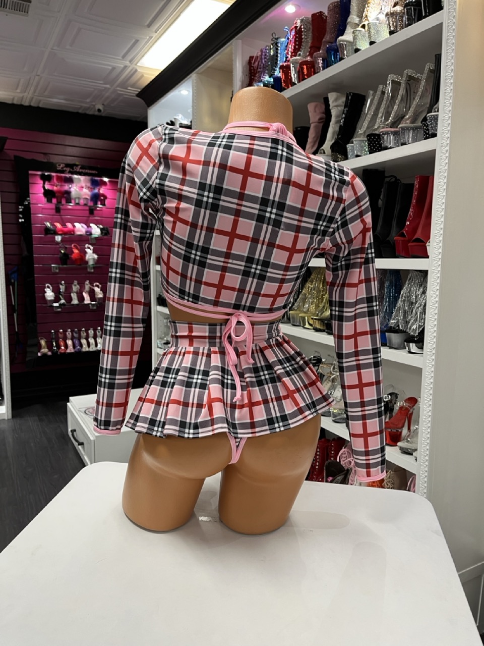 Flirty plaid 4 piece set featuring a long sleeve crop top and matching flared mini skirt and bikini. Stretchy, comfortable, and perfect for stage, themed nights, and photoshoots.