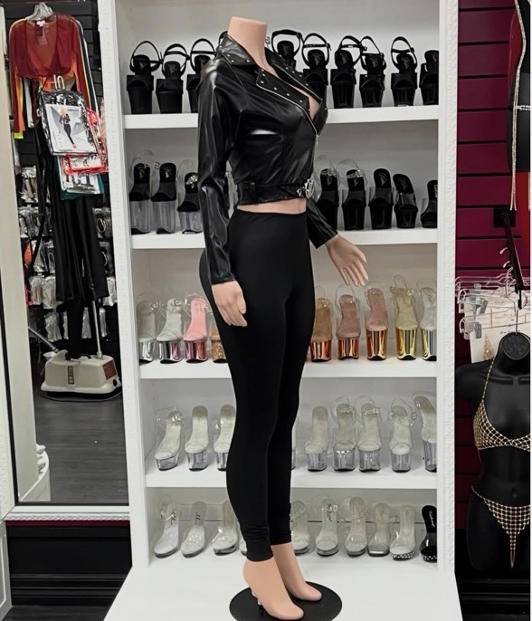 “Playboy Greaser costume set with zip-up jacket, belt, and leggings”