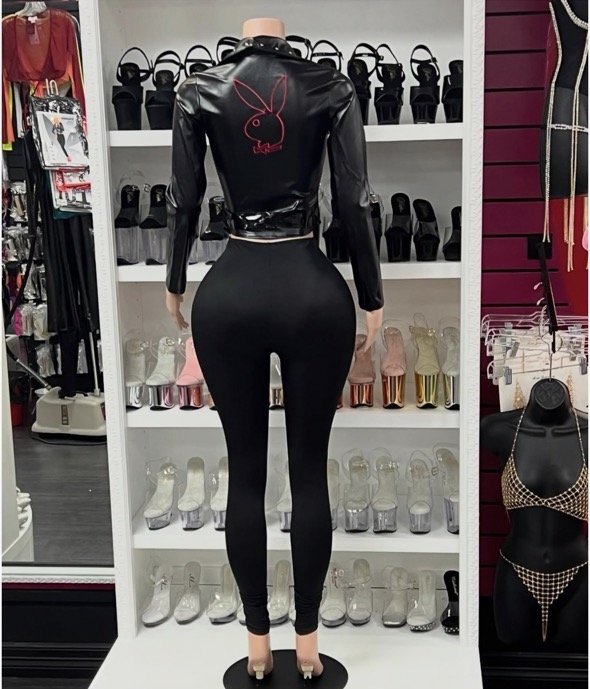 Channel retro rebellion in the Playboy Greaser Costume Set, featuring a zip-up jacket, leggings, and iconic bunny belt.