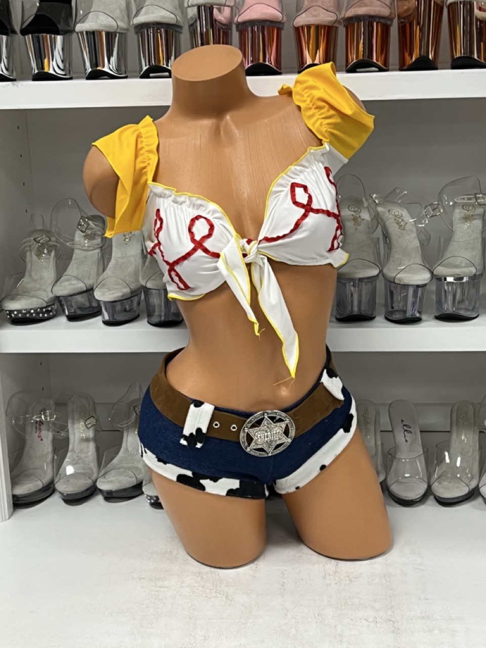 This playful story cowgirl costume features a white cropped tie top with yellow ruffle sleeves, matching belt, and denim brazilian cut shorts. The three-piece Western ensemble combines authentic ranch styling with contemporary appeal for the perfect frontier transformation. Ideal for Western parties, country events, and themed celebrations. No returns/exchanges.