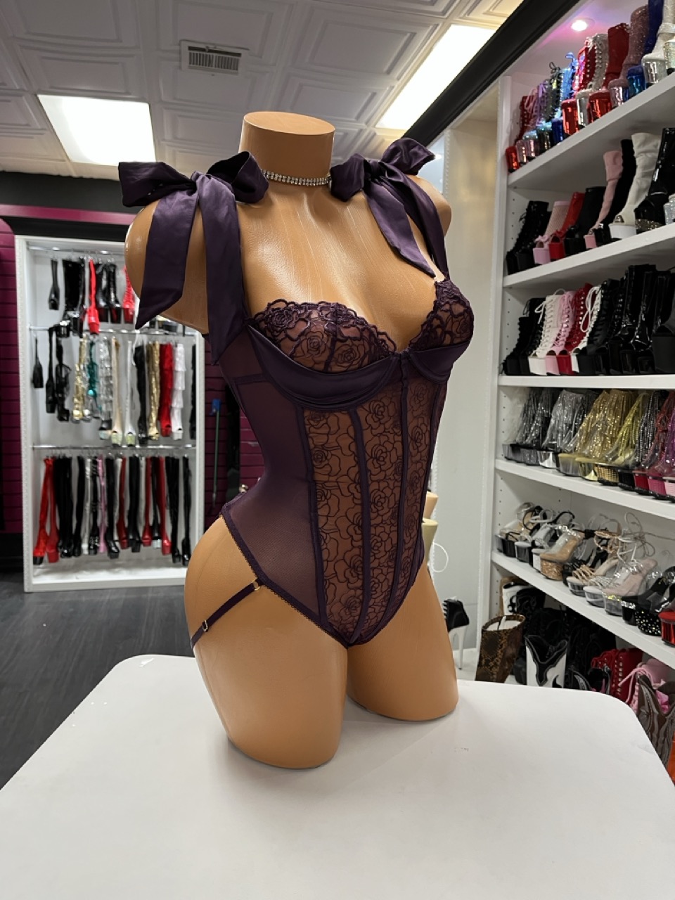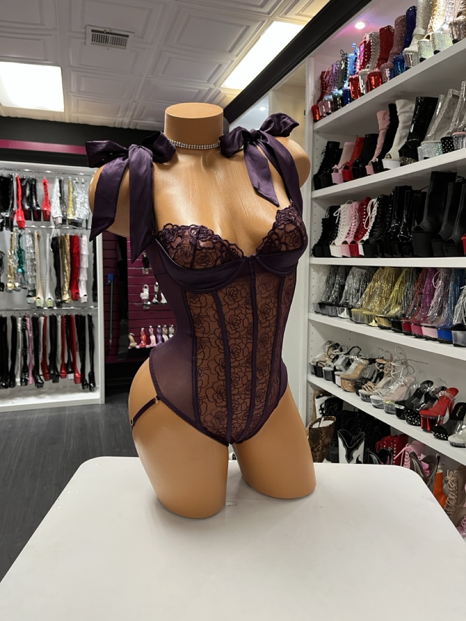 Elegant plum mesh bodysuit with floral detailing, supportive cups, and ribbon shoulder ties. Soft, structured, and perfect for romantic performance looks.