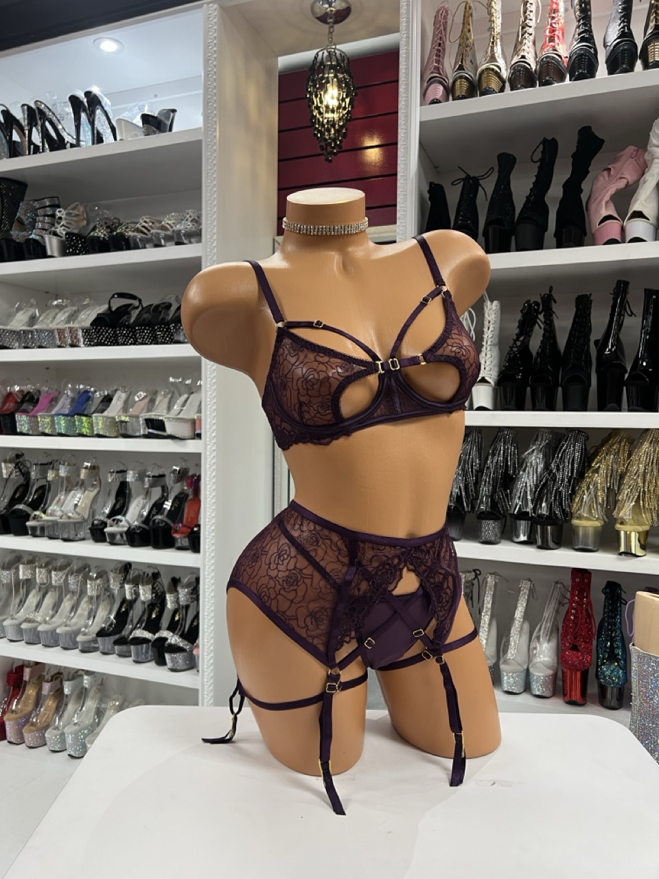 plum lace garter lingerie set on mannequin