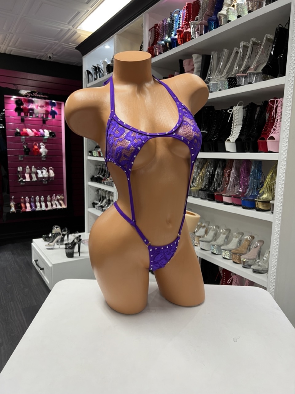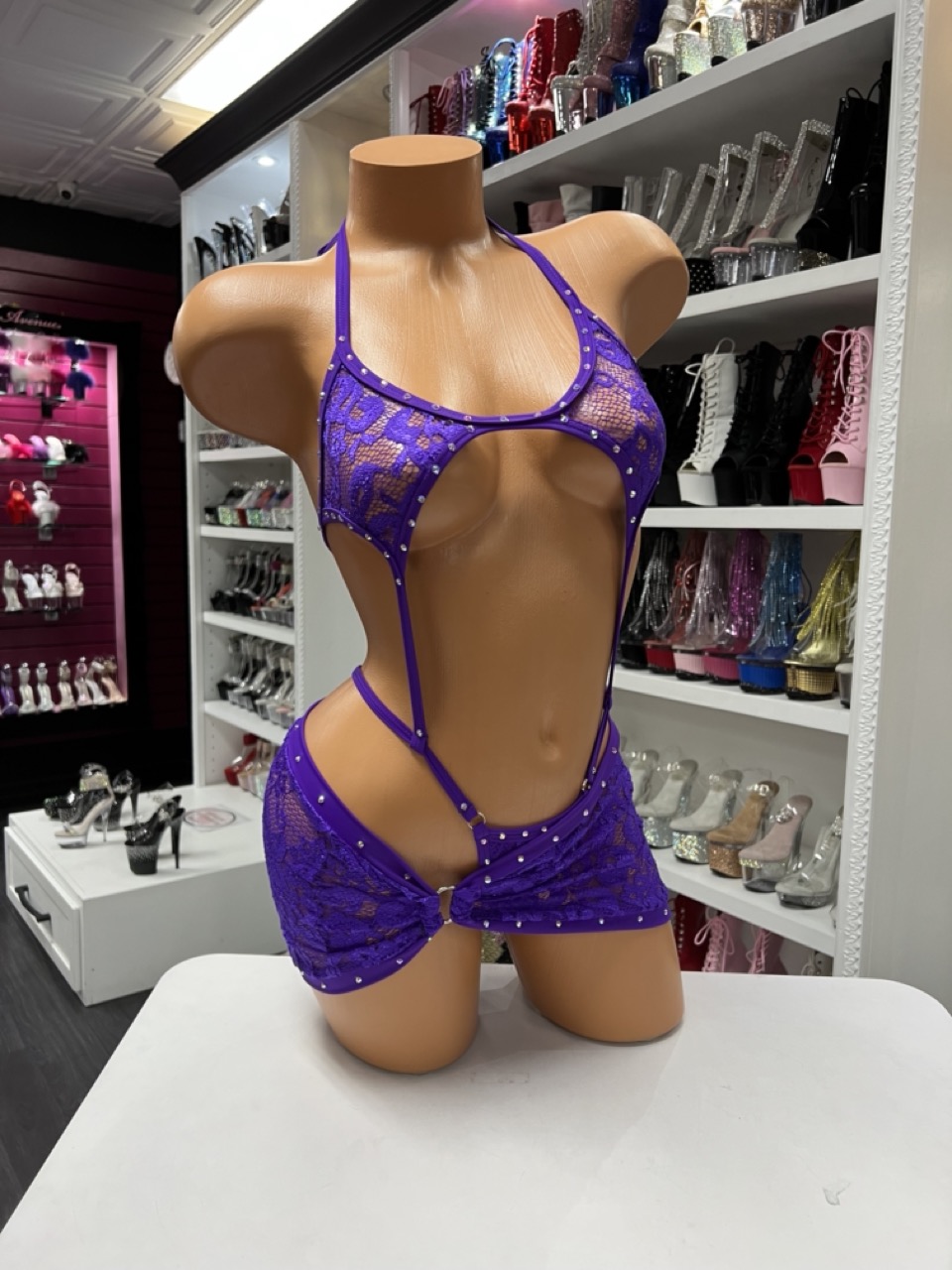 Purple lace two piece skirt set with cutout bodysuit and matching mini skirt. Designed for bold and versatile styling.