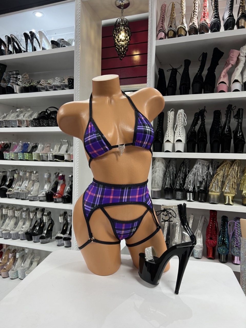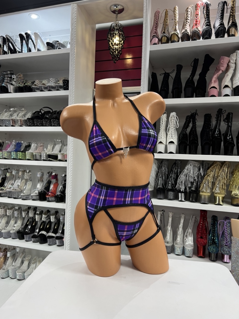 A playful purple plaid micro set with an attached garter belt for a bold, confident stage look. Lightweight, stretchy, and perfect for dancers who want color and shape.