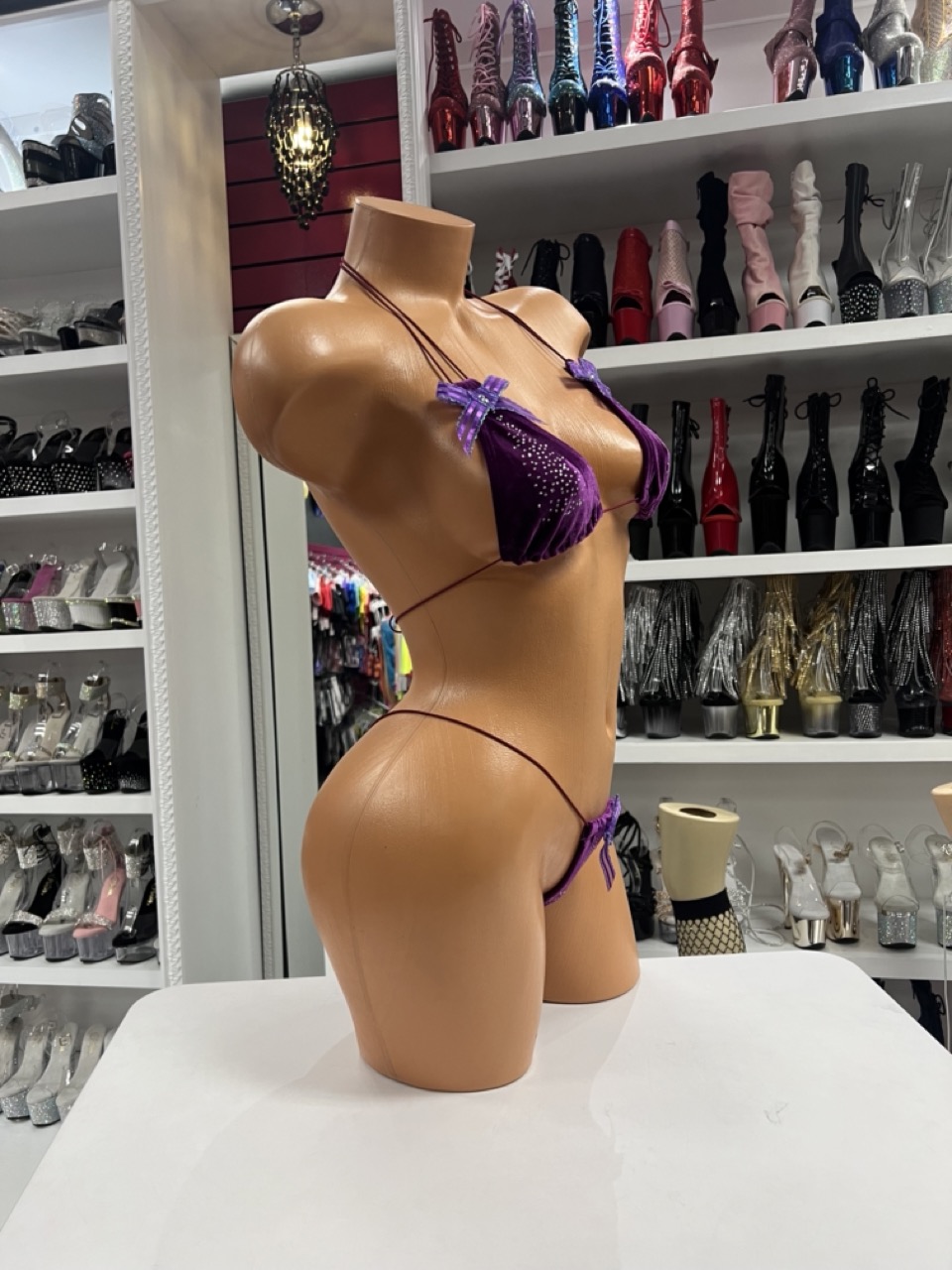 Purple rhinestone bikini with flirty bow details and minimal string fit.