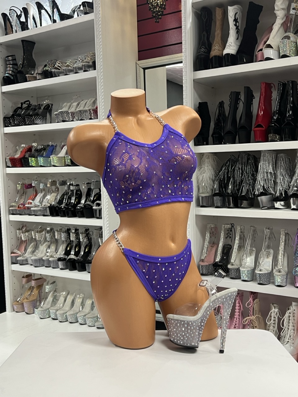 The Purple Rhinestone Lingerie Set includes a sheer crop top and thong bottom with rhinestones and chain strap details, perfect for stagewear and clubwear.