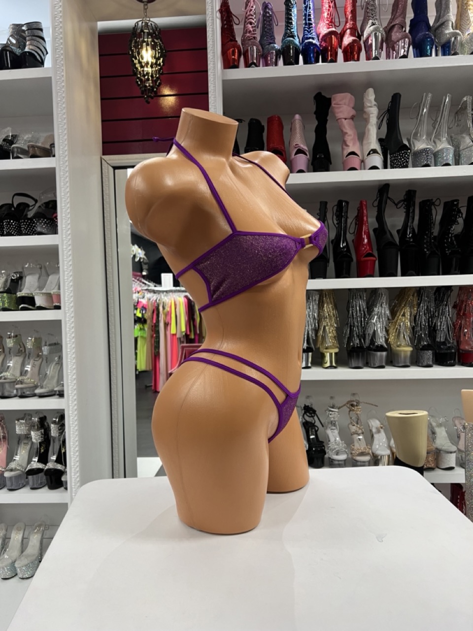 Purple shimmer micro bikini with minimal design and double strap detail. Bold, sleek, and designed for a flattering fit.