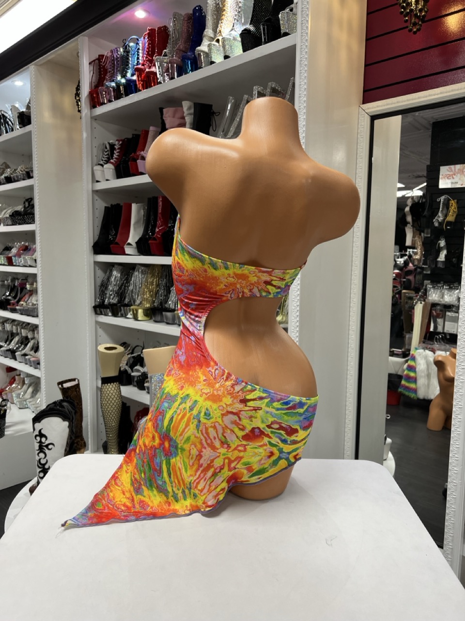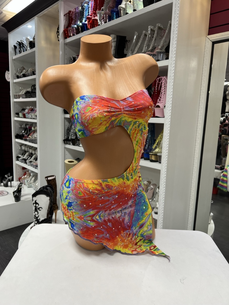 A rainbow cutout mini dress with strapless design and bold swirl print. Perfect for standout performances and nightlife looks.