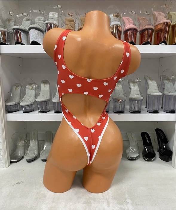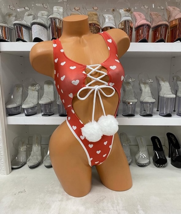 Red heart lace up bodysuit with adjustable plunge front and soft white pom detail. Romantic print meets bold stage-ready styling.