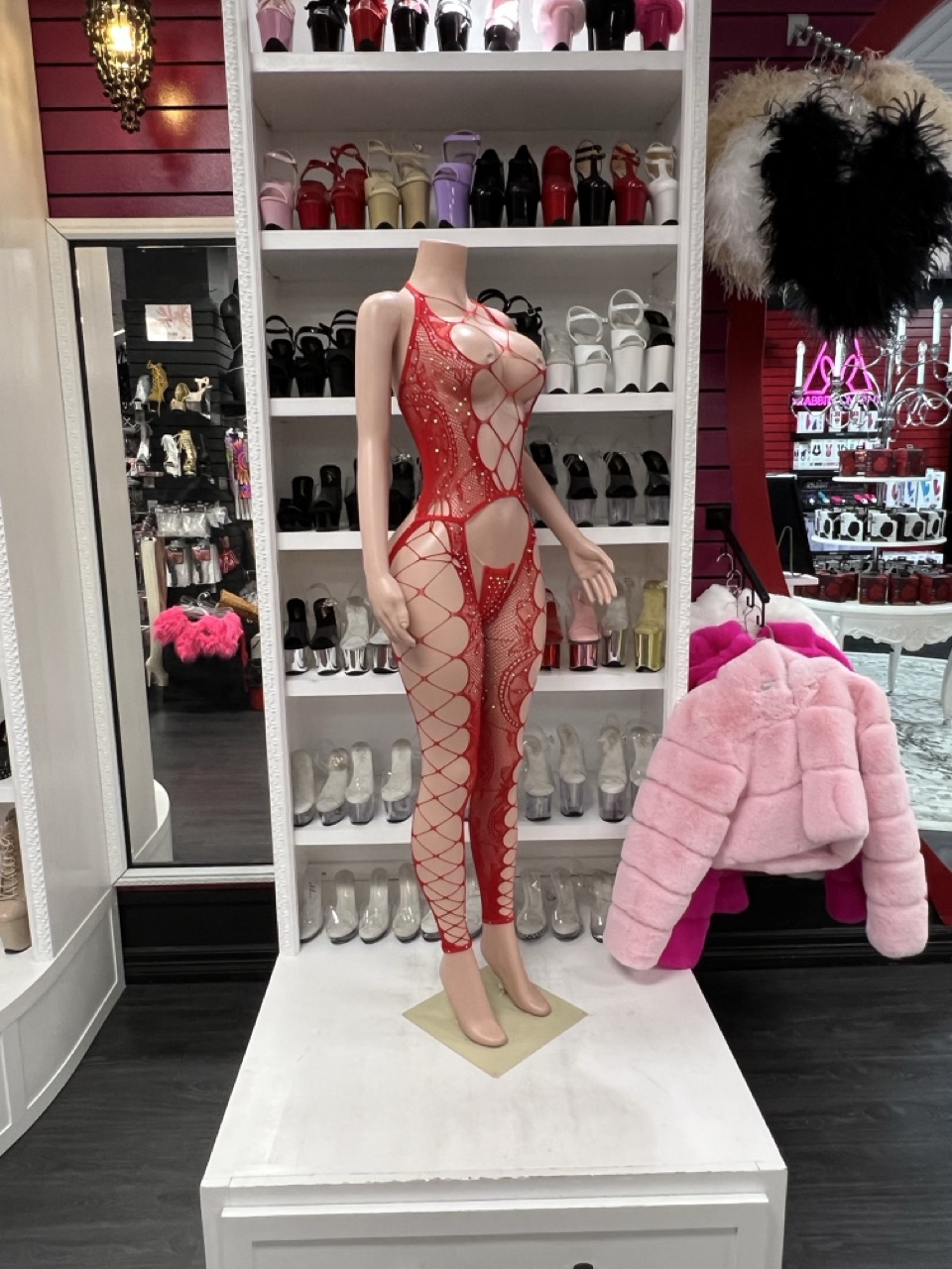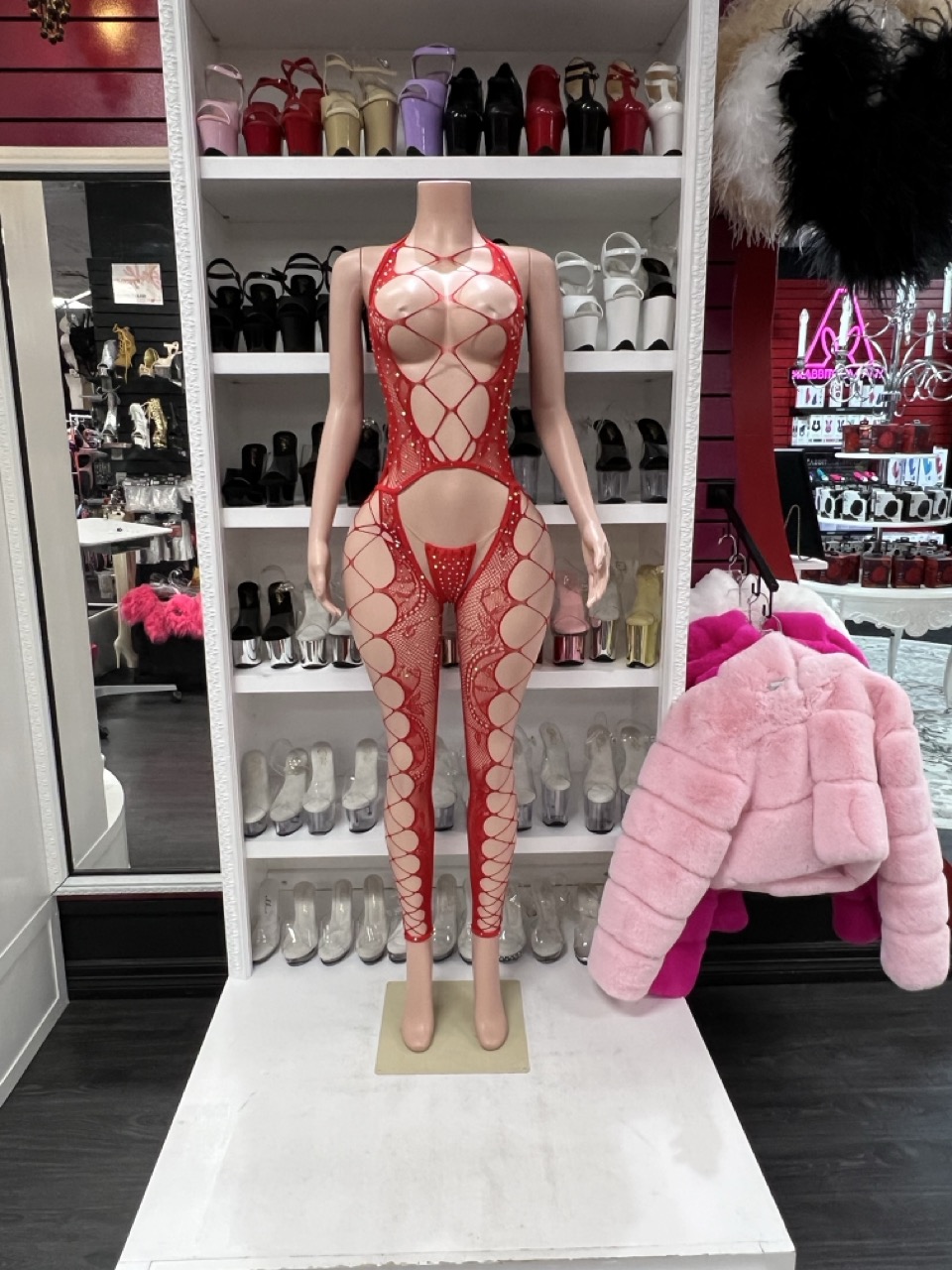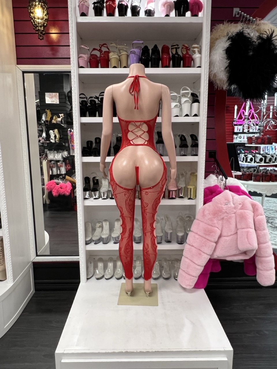 Red lace full bodysuit with a bold sheer design and sculpted fit. Eye-catching, sleek, and made to stand out.
