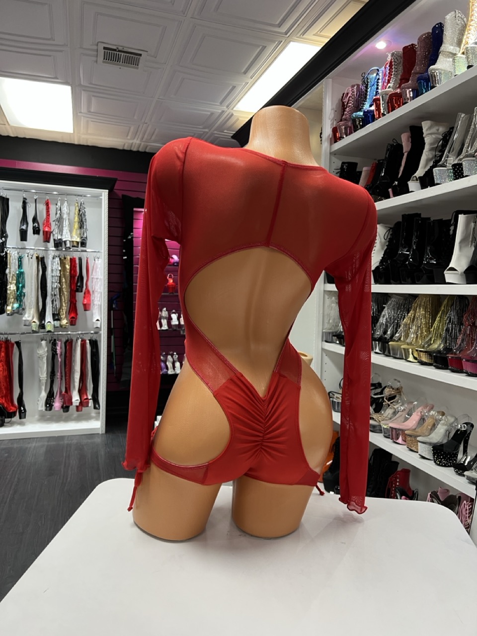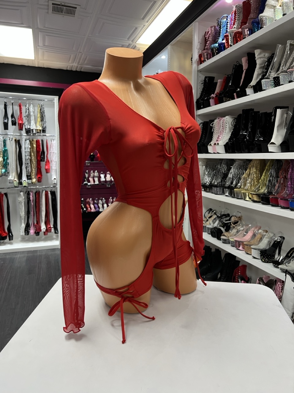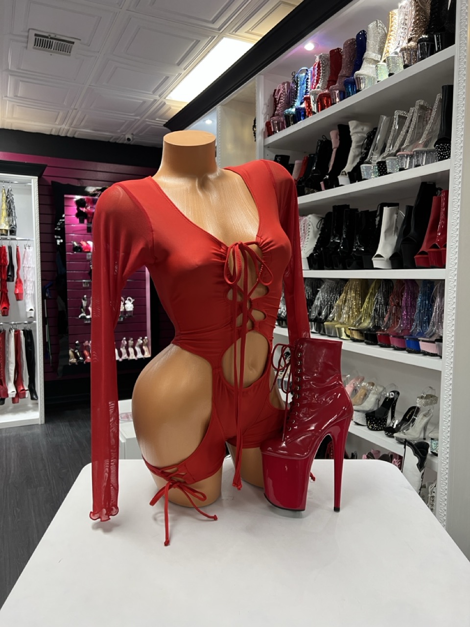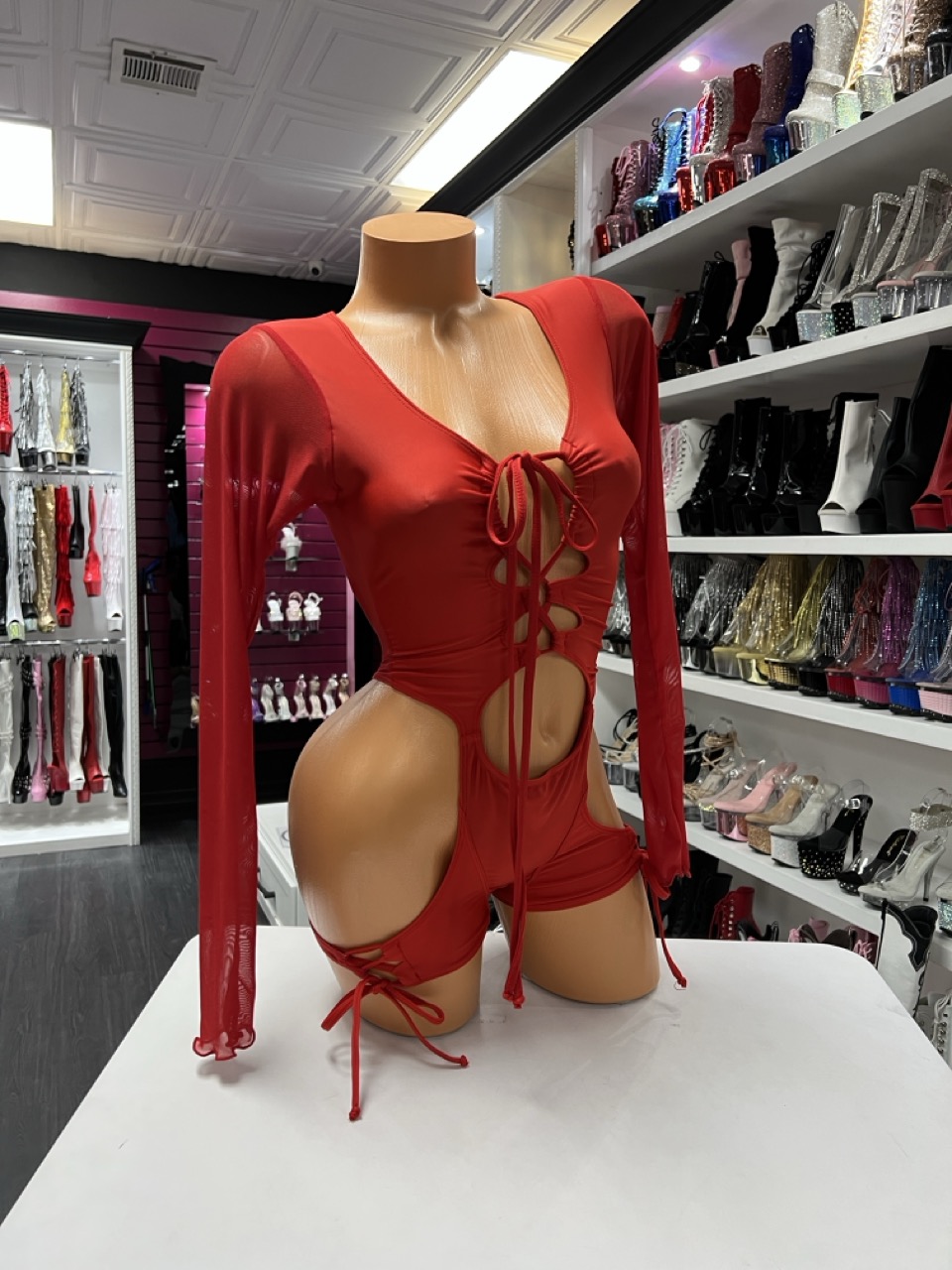 Bold red lace-up romper featuring sculpting stretch fabric, open cutout details, and long sleeves for a confident, statement-making silhouette.