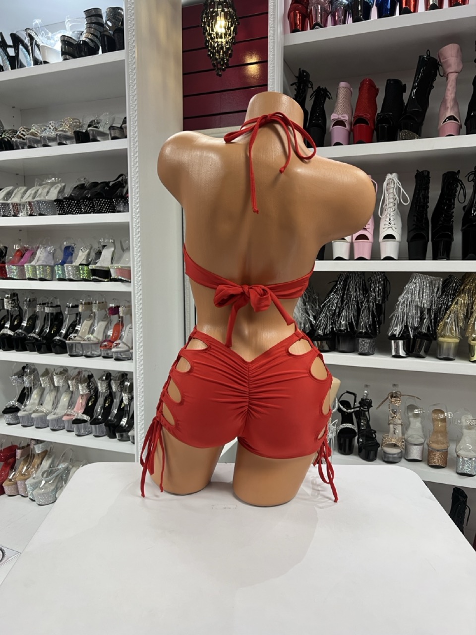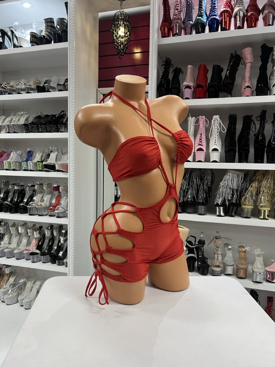 Bold red lace up romper featuring adjustable side lacing, halter neckline, and sculpting stretch fabric designed to highlight your curves beautifully