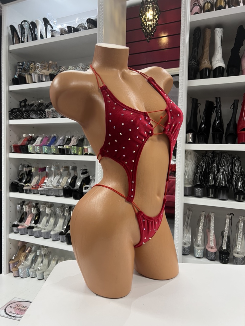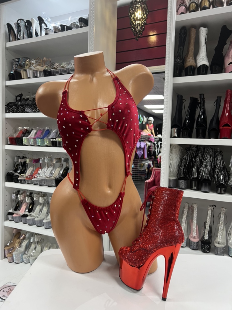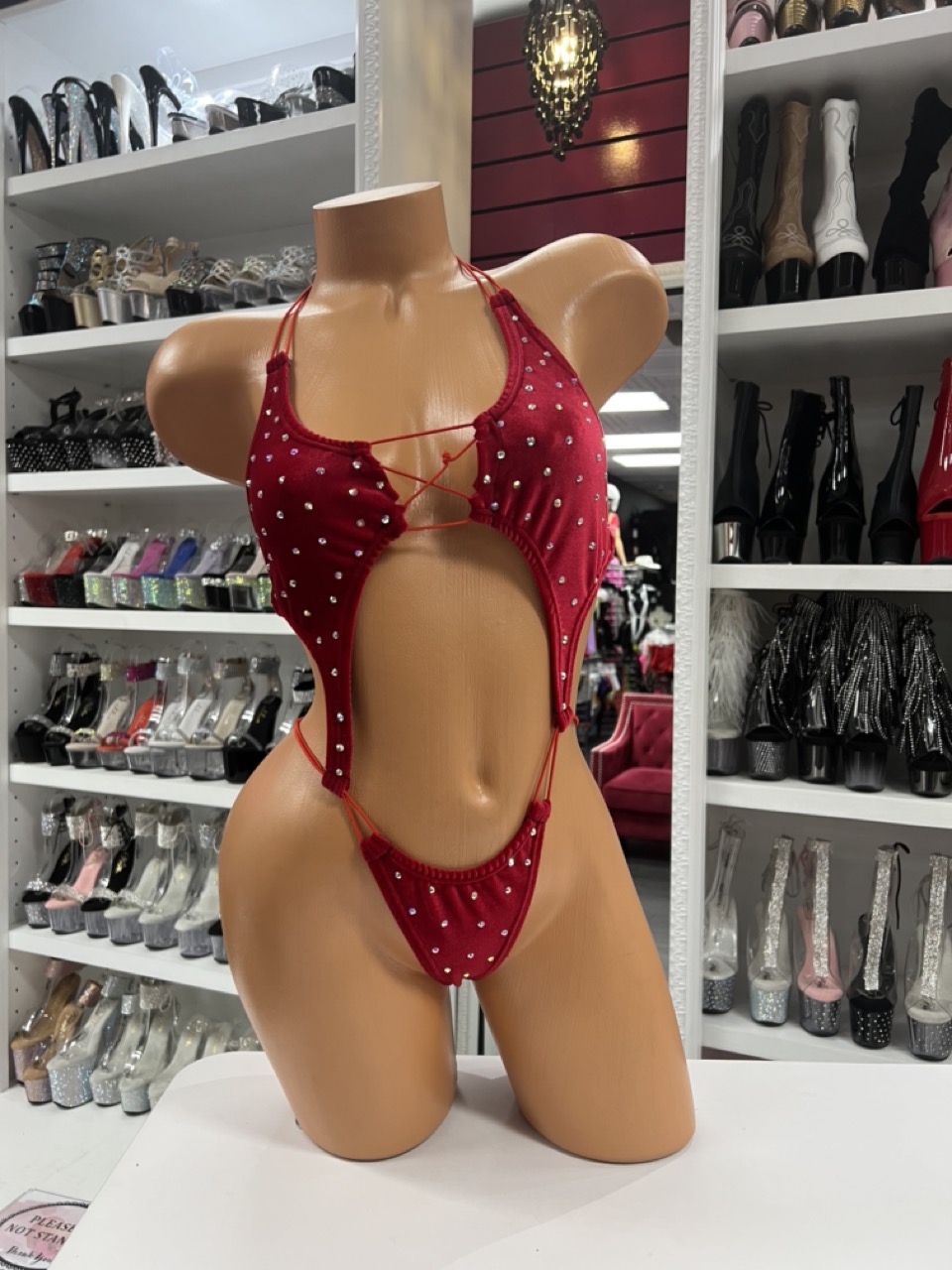 Red rhinestone romper with lace-up front and cutout details