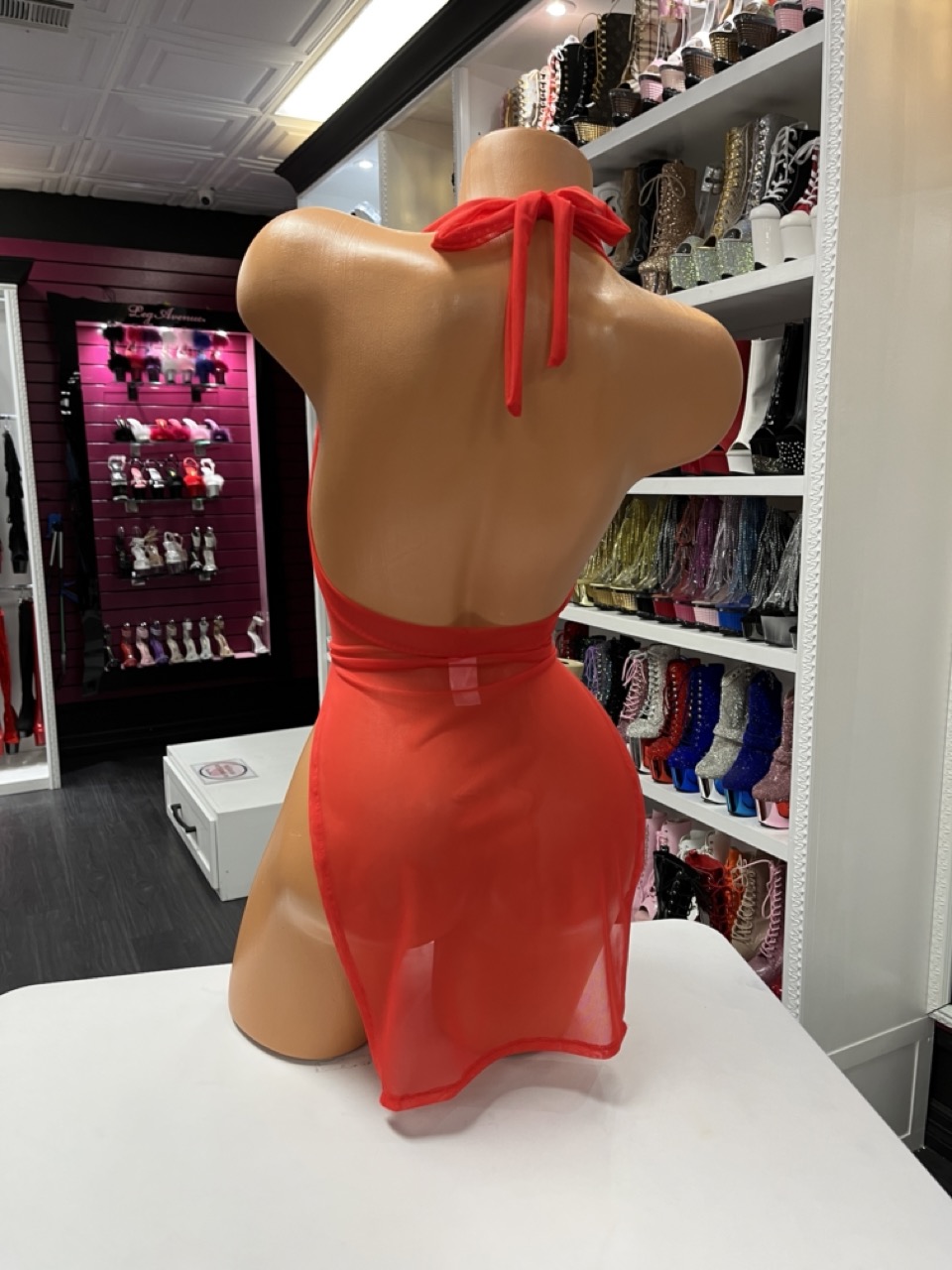 Sheer red mesh halter dress with a draped neckline and flowing silhouette. Designed for bold movement and confident stage looks.