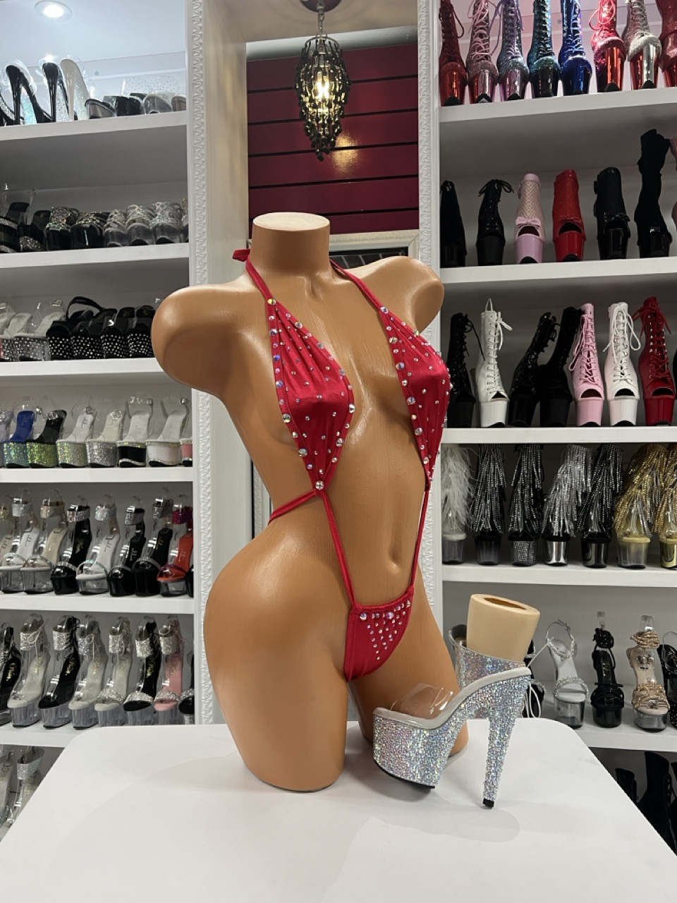 A bold red bodysuit with rhinestone accents and a flattering front cutout. Designed for confident performers who want sparkle and secure movement.