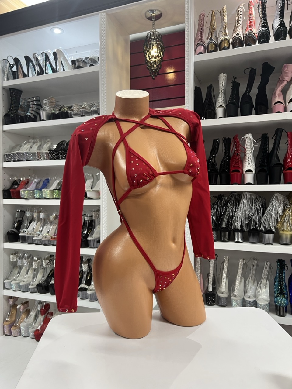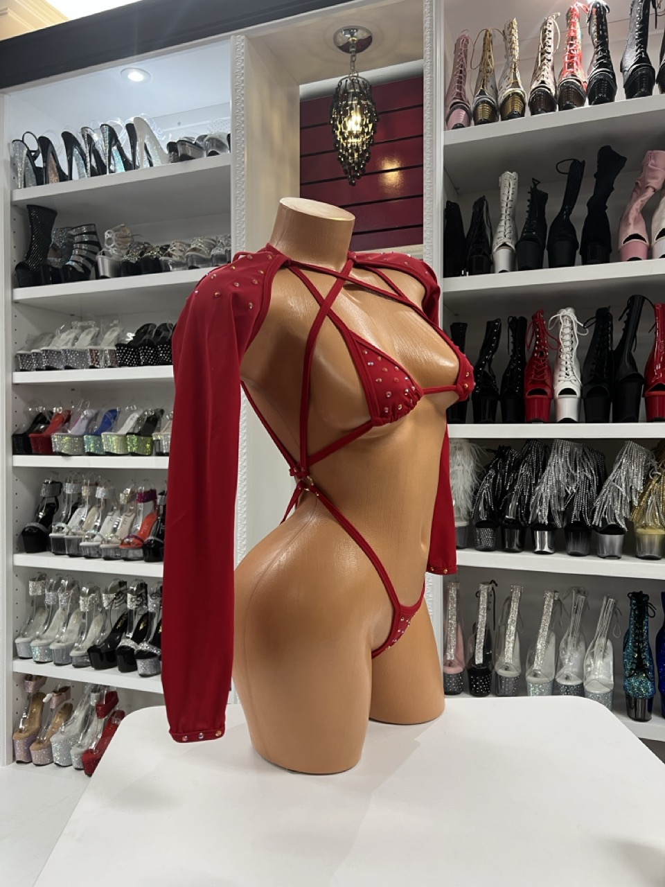 Red Rhinestone Cutout Set with matching thong and sleeve bolero. Strappy, sparkly, and made to turn heads.
