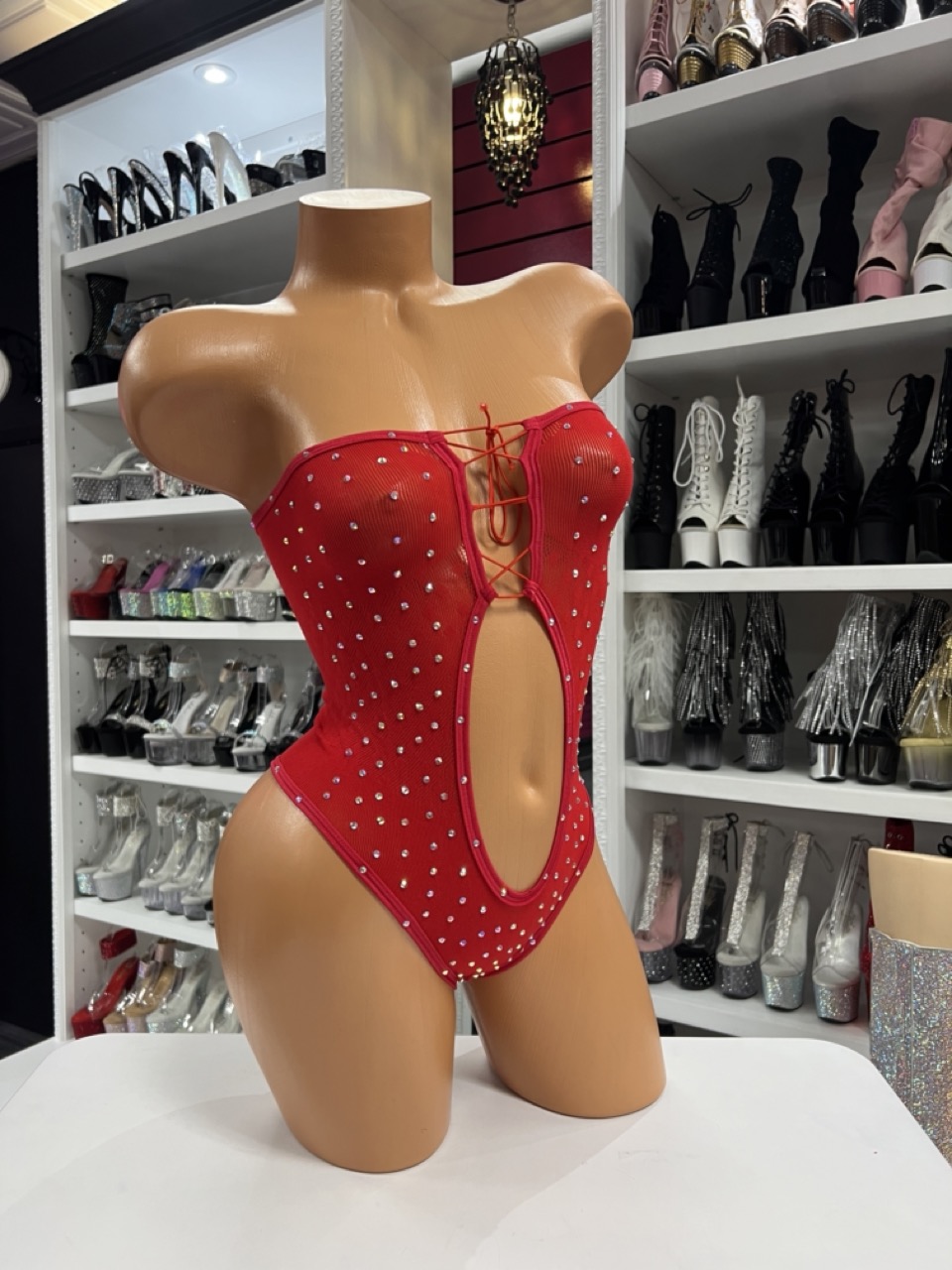A bold red rhinestone lace-up bodysuit with a dramatic cutout and soft stretch fabric. Perfect for dancers, nightlife, and high-impact photoshoots.