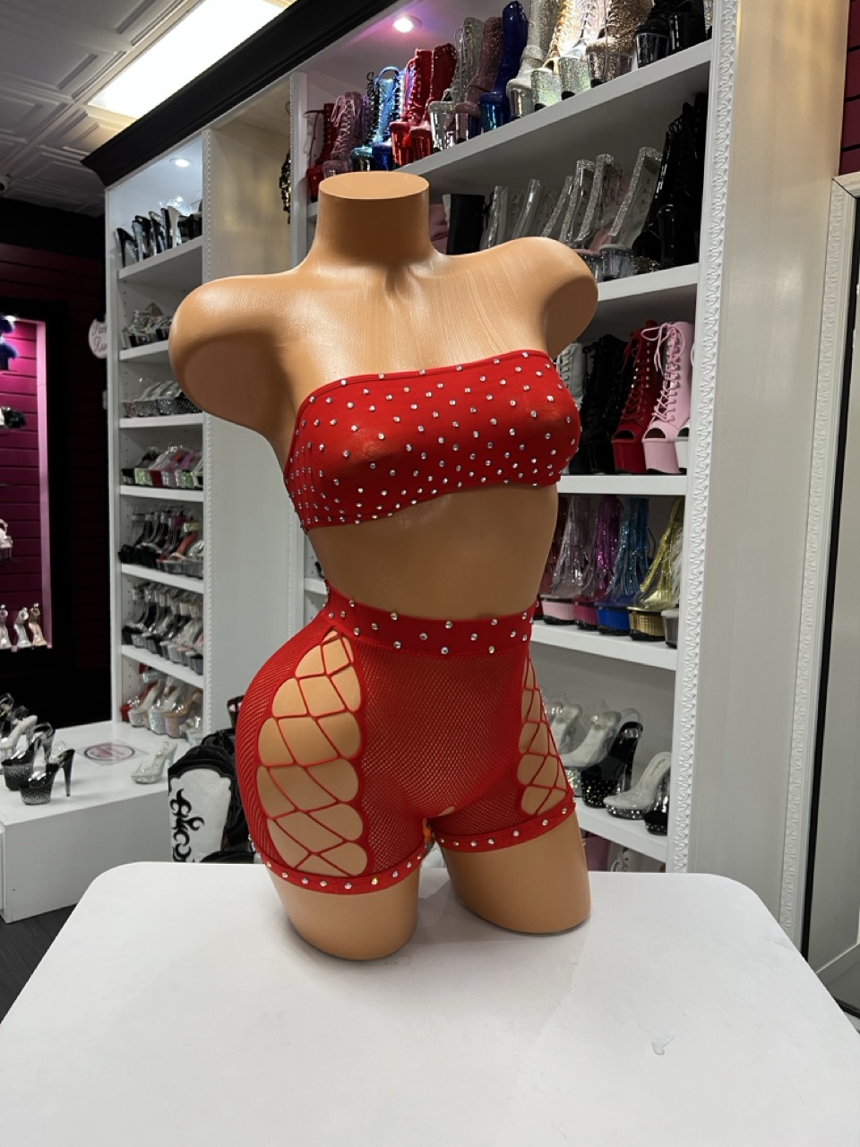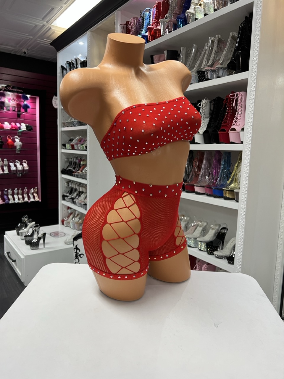 Bold and eye-catching, this red rhinestone mesh set features sparkling details and a sleek fit. Designed for comfort, stretch, and standout style.
