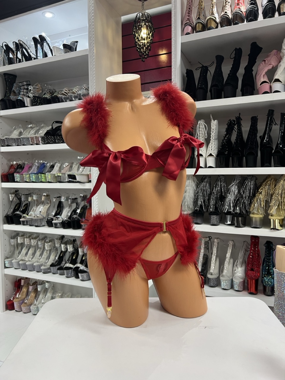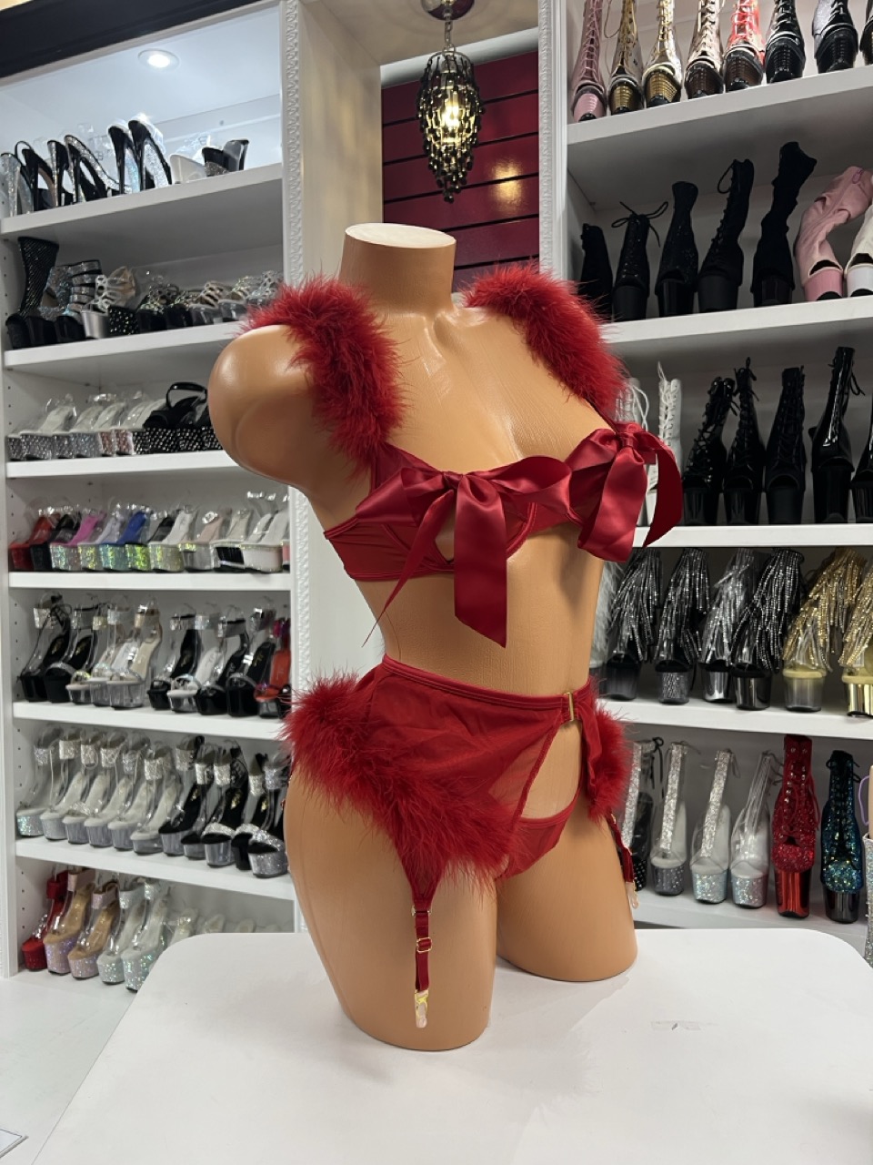 red ribbon feather lingerie set on mannequin