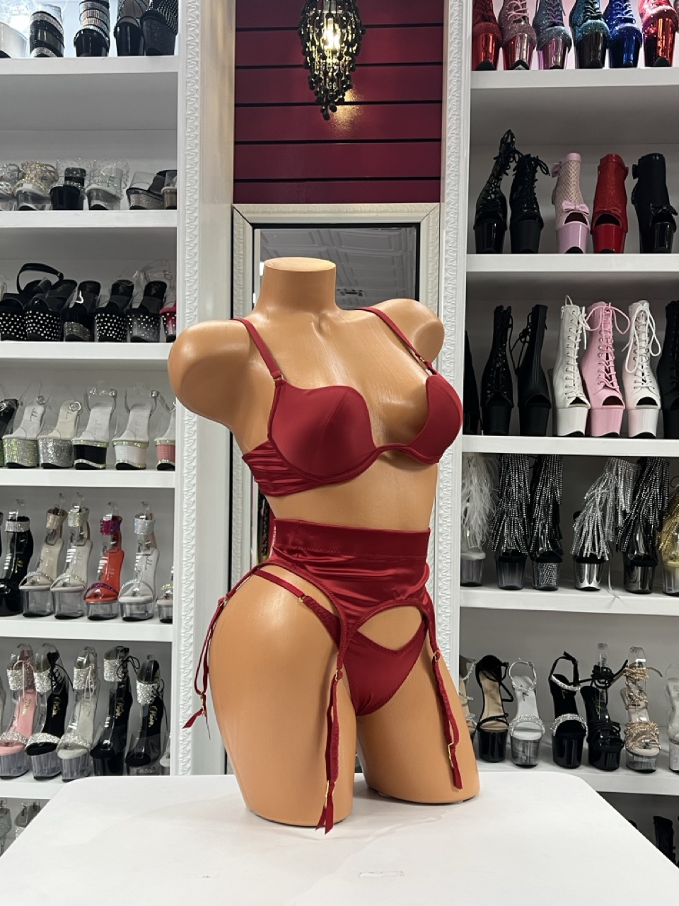Red satin lingerie set with structured bra, high-waist garter belt, adjustable straps, and matching thong displayed on mannequin in boutique showroom