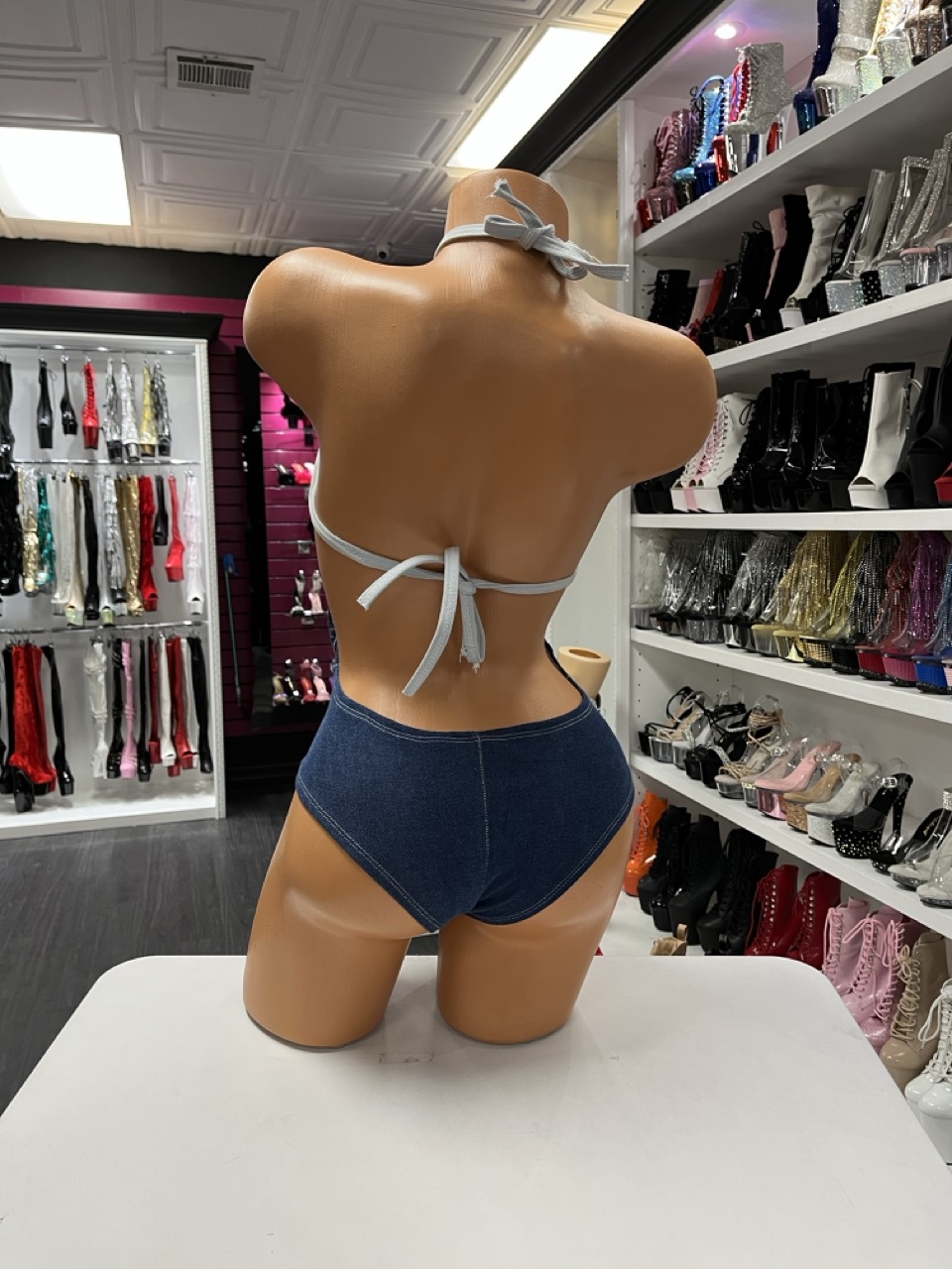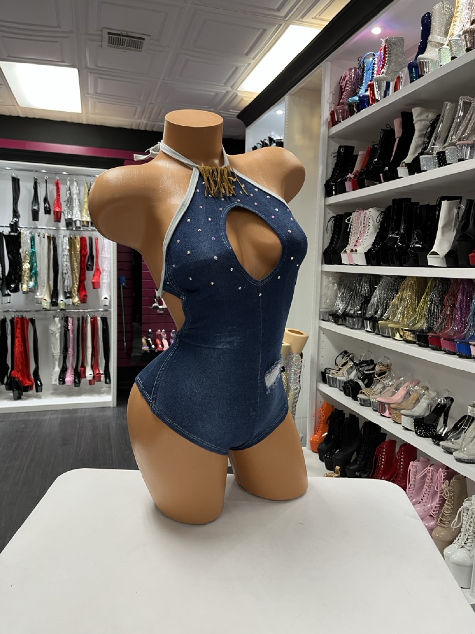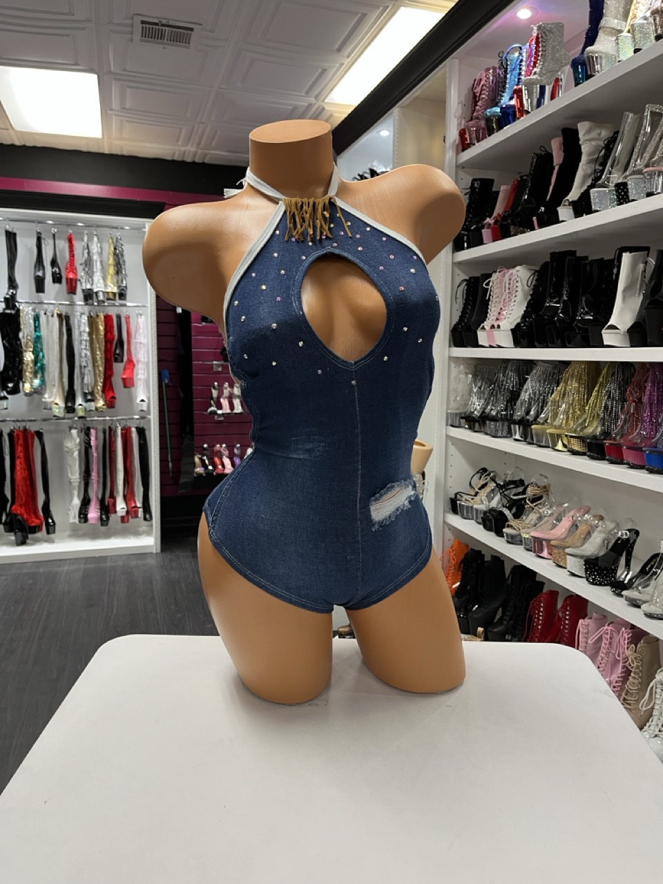 Rhinestone denim halter romper with keyhole cutout Western outfit