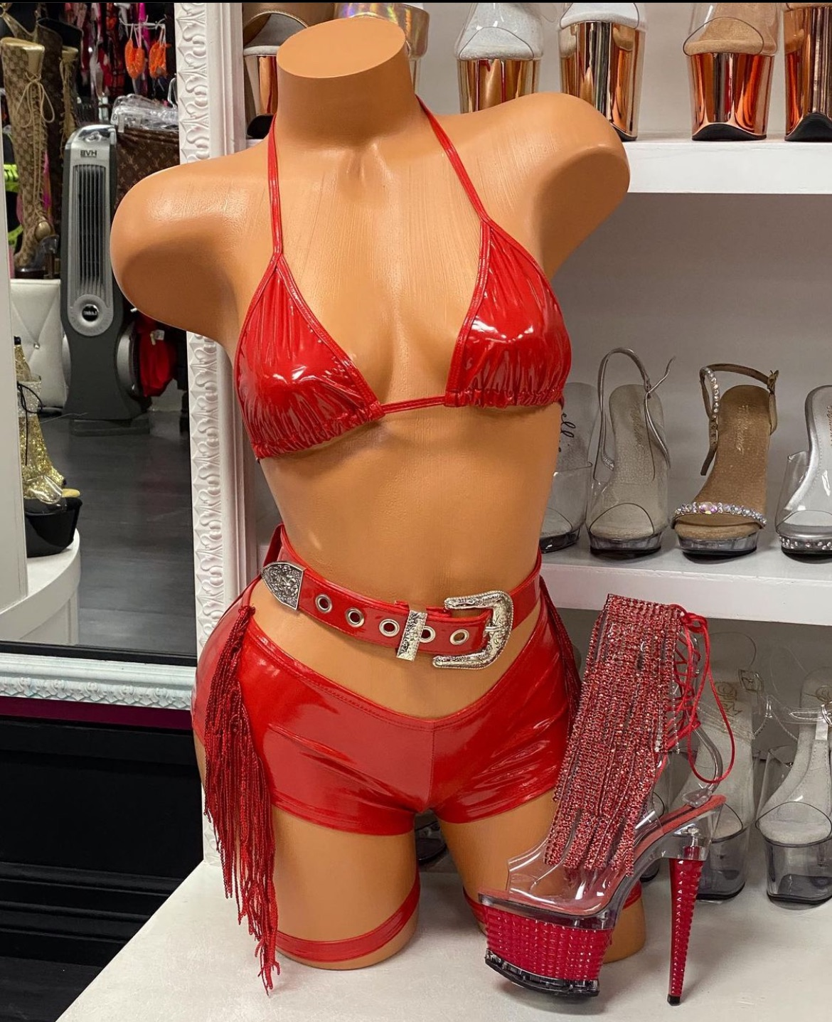 This four-piece set features a shiny red bikini-style top and matching high-waisted bottoms. Both pieces are crafted in a sleek, metallic material that reflects light beautifully. Additionally, the high-waisted shorts come with a silver-buckled western belt for a touch of authentic cowgirl charm.