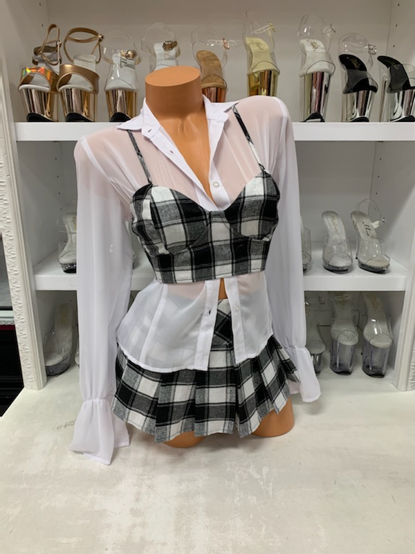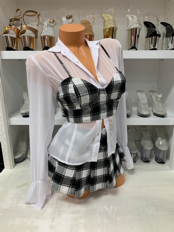 Includes: Blouse, Bustier, Pleated Skirt and Hat. No returns or exchanges.